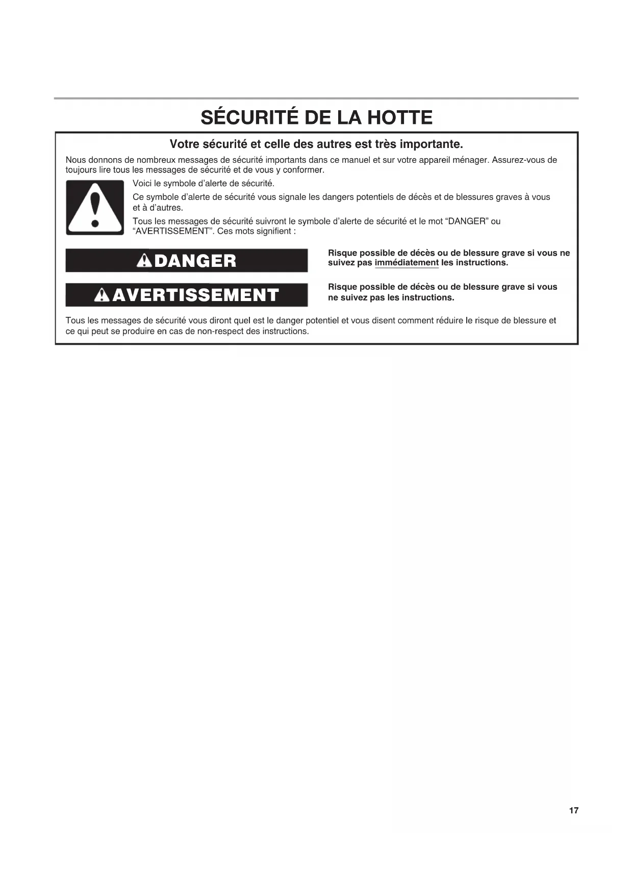 Risque possible de décès ou de blessure grave si vous ne suivez pas immédiatement les instructions. Risque possible de décès ou de blessure grave si vous ne suivez pas les instructions. Tous les messages de sécurité vous diront quel est le danger potentiel et vous disent comment réduire le risque de blessure et ce qui peut se produire en cas de non-respect des instructions. Votre sécurité et celle des autres est très importante. Nous donnons de nombreux messages de sécurité importants dans ce manuel et sur votre appareil ménager. Assurez-vous de toujours lire tous les messages de sécurité et de vous y conformer. AVERTISSEMENT DANGER Voici le symbole d’alerte de sécurité. Ce symbole d’alerte de sécurité vous signale les dangers potentiels de décès et de blessures graves à vous et à d’autres. Tous les messages de sécurité suivront le symbole d’alerte de sécurité et le mot “DANGER” ou “AVERTISSEMENT”. Ces mots signifient :18