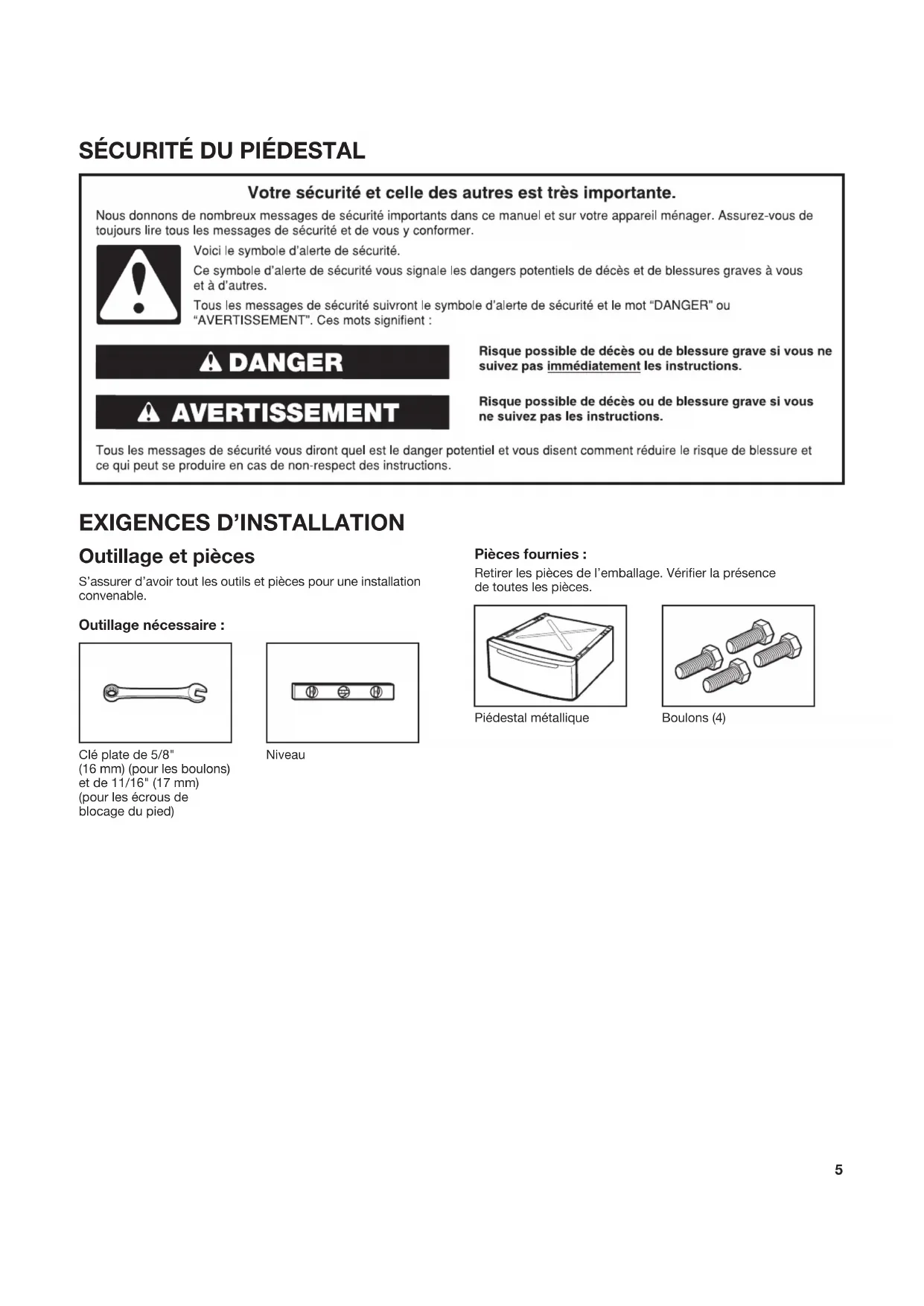 Boulons (4)6 Exigences d’emplacement Si la laveuse et la sécheuse Tout-en-un avec l’ensemble du piédestal est installée dans un garage, il est nécessaire d’ajouter 6" (152 mm) sous le piédestal an que la laveuse et la sécheuse Tout-en-un soit à 18" (460 mm) au-dessus du plancher du garage. Un élévateur séparé, capable de supporter au moins 275 lb (125 kg), peut être nécessaire. L’ensemble du piédestal doit reposer complètement sur l’élévateur. Avant l’installation du piédestal IMPORTANT : Si la laveuse et la sécheuse tout-en-un est déjà installée, elle doit être désinstallée. Si l’on a besoin de désinstaller la laveuse et la sécheuse tout-en-un, voir les Instructions d’installation fournies avec votre modèle pour les outils nécessaires. Désinstallation de la laveuse et la sécheuse tout-en-un