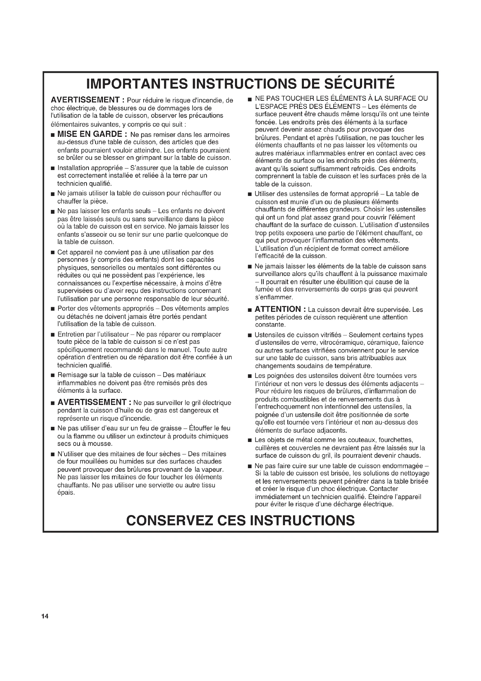 NE PAS TOUCHER LES ÉLÉMENTS À LA SURFACE OU L’ESPACE PRÈS DES ÉLÉMENTS – Les éléments de surface peuvent être chauds même lorsqu’ils ont une teinte foncée. Les endroits près des éléments à la surface peuvent devenir assez chauds pour provoquer des brûlures. Pendant et après l’utilisation, ne pas toucher les éléments chauffants et ne pas laisser les vêtements ou autres matériaux inflammables entrer en contact avec ces éléments de surface ou les endroits près des éléments, avant qu’ils soient suffisamment refroidis. Ces endroits comprennent la table de cuisson et les surfaces près de la table de la cuisson. ■ Utiliser des ustensiles de format approprié – La table de cuisson est munie d’un ou de plusieurs éléments chauffants de différentes grandeurs. Choisir les ustensiles qui ont un fond plat assez grand pour couvrir l’élément chauffant de la surface de cuisson. L’utilisation d’ustensiles trop petits exposera une partie de l’élément chauffant, ce qui peut provoquer l’inflammation des vêtements. L’utilisation d’un récipient de format correct améliore l’efficacité de la cuisson. ■ Ne jamais laisser les éléments de la table de cuisson sans surveillance alors qu’ils chauffent à la puissance maximale – Il pourrait en résulter une ébullition qui cause de la fumée et des renversements de corps gras qui peuvent s’enflammer. ■ ATTENTION : La cuisson devrait être supervisée. Les petites périodes de cuisson requièrent une attention constante. ■ Ustensiles de cuisson vitrifiés – Seulement certains types d’ustensiles de verre, vitrocéramique, céramique, faïence ou autres surfaces vitrifiées conviennent pour le service sur une table de cuisson, sans bris attribuables aux changements soudains de température. ■ Les poignées des ustensiles doivent être tournées vers l’intérieur et non vers le dessus des éléments adjacents – Pour réduire les risques de brûlures, d’inflammation de produits combustibles et de renversements dus à l’entrechoquement non intentionnel des ustensiles, la poignée d’un ustensile doit être positionnée de sorte qu’elle est tournée vers l’intérieur et non au-dessus des éléments de surface adjacents. ■ Les objets de métal comme les couteaux, fourchettes, cuillères et couvercles ne devraient pas être laissés sur la surface de cuisson du gril, ils pourraient devenir chauds. ■ Ne pas faire cuire sur une table de cuisson endommagée –