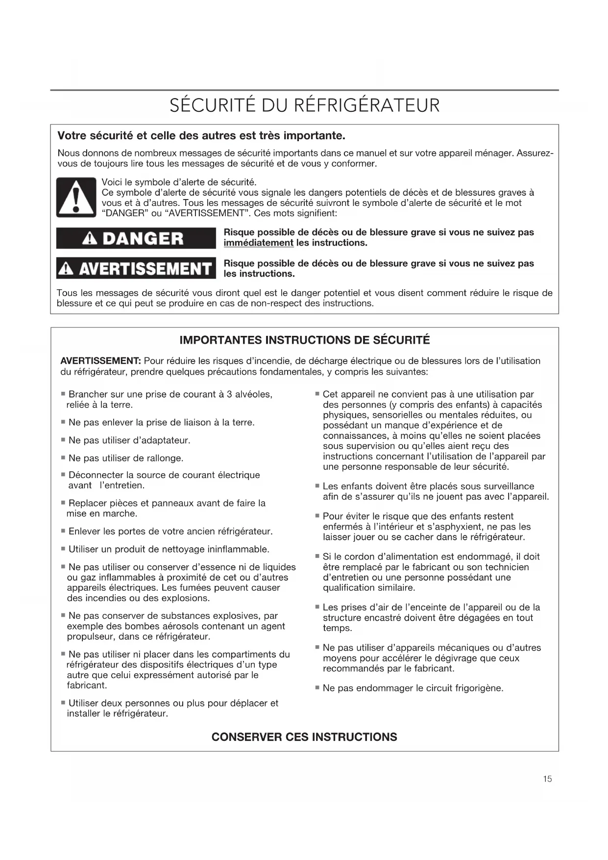 du réfrigérateur, prendre quelques précautions fondamentales, y compris les suivantes: Voici le symbole d’alerte de sécurité. Ce symbole d’alerte de sécurité vous signale les dangers potentiels de décès et de blessures graves à vous et à d’autres. Tous les messages de sécurité suivront le symbole d’alerte de sécurité et le mot “DANGER” ou “AVERTISSEMENT”. Ces mots signifient: Brancher sur une prise de courant à 3 alvéoles, reliée à la terre. Ne pas enlever la prise de liaison à la terre. Ne pas utiliser d’adaptateur. Ne pas utiliser de rallonge. Déconnecter la source de courant électrique avant l’entretien. Replacer pièces et panneaux avant de faire la mise en marche. Enlever les portes de votre ancien réfrigérateur. Utiliser un produit de nettoyage ininflammable. Ne pas utiliser ou conserver d’essence ni de liquides ou gaz inflammables à proximité de cet ou d’autres appareils électriques. Les fumées peuvent causer des incendies ou des explosions. Ne pas conserver de substances explosives, par exemple des bombes aérosols contenant un agent propulseur, dans ce réfrigérateur. Ne pas utiliser ni placer dans les compartiments du réfrigérateur des dispositifs électriques d’un type autre que celui expressément autorisé par le fabricant. Utiliser deux personnes ou plus pour déplacer et installer le réfrigérateur. Cet appareil ne convient pas à une utilisation par des personnes (y compris des enfants) à capacités physiques, sensorielles ou mentales réduites, ou possédant un manque d’expérience et de connaissances, à moins qu’elles ne soient placées sous supervision ou qu’elles aient reçu des instructions concernant l’utilisation de l’appareil par une personne responsable de leur sécurité. Les enfants doivent être placés sous surveillance afin de s’assurer qu’ils ne jouent pas avec l’appareil. Pour éviter le risque que des enfants restent enfermés à l’intérieur et s’asphyxient, ne pas les laisser jouer ou se cacher dans le réfrigérateur. Si le cordon d’alimentation est endommagé, il doit être remplacé par le fabricant ou son technicien d’entretien ou une personne possédant une qualification similaire. Les prises d’air de l’enceinte de l’appareil ou de la structure encastré doivent être dégagées en tout temps. Ne pas utiliser d’appareils mécaniques ou d’autres moyens pour accélérer le dégivrage que ceux recommandés par le fabricant. Ne pas endommager le circuit frigorigène.
