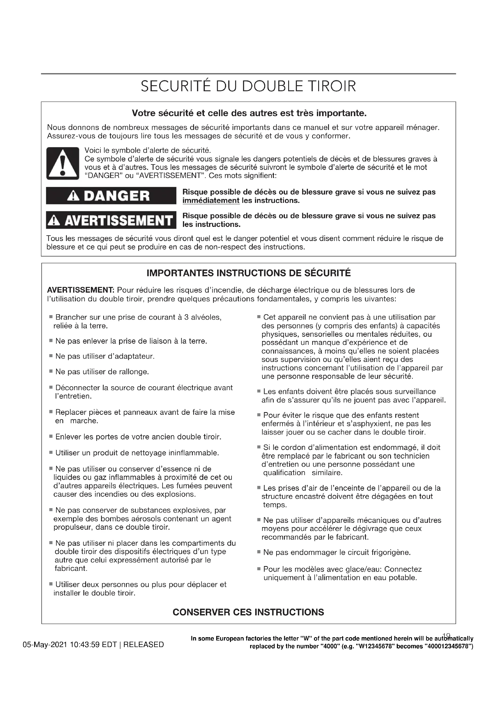05-May-2021 10:43:59 EDT | RELEASED In some European factories the letter "W" of the part code mentioned herein will be automatically replaced by the number "4000" (e.g. "W12345678" becomes "400012345678")UTILISATION GÉNÉRALE Causes Possibles et Solutions Recommandées Le double tiroir apparemment fait trop de bruit Le diviseur entre les deux compartiments est chaud Les bruits peuvent être normaux pour votre réfrigérateur à tiroirs? Voyez “Bruits Normaux”. La chaleur est probablement le produit de l’opération normale du contrôle automatique d’humidité extérieur? Si vous êtes toujours inquiet, contactez le service. La témperature est trop élevée Il y a de l’accumulation intérieure d’humidité Les bouches d’aération d’un compartiment sont bloquées? Cela obstrue la circulation d’air froid entre les compartiments. Enlevez les objets qui sont devant les bouches d’aération. Voyez “Comment Assurer la Circulation Appropriée de l’Air” pour identifi er la localisation des bouches d’aération. Les tiroirs sont ouverts fréquemment? Le réfrigérateur à tiroirs réchauffera si cela se produit. Maintenez le réfrigérateur à tiroirs froid en prenant tous les produits à la fois, en maintenant la nourriture organisée et en fermant la porte aussi que possible. Une grande quantité de nourriture a été placée dans le réfrigérateur à tiroirs? Placer une grande quantité de nourriture réchauffe le réfrigérateur à tiroirs. Plusieurs heures peuvent se passer avant que le réfrigérateur à tiroirs revienne à sa température normale. Les commandes avaient été réglées correctement pour les conditions ambiantes? Voyez “Utilisation des Commandes”. Le double tiroir ne se refroidit pas? Étendre-le et allumez-le pour en réinitialiser. Voyez “Utilisation des Commandes”. Si cela ne corrige pas le problème, contactez le service. La machine à glaçons (Ice Maker) est en train de fonctionner? Lorsque la machine à glaçons est en train de fonctionner, il réchauffe le réfrigérateur. Le moteur fonctionnera normalement pour faire du glaçon. Si la machine à glaçons est allumée lorsque de l’eau ne peut pas être fournie automatiquement (ne connectée pas à une source d’eau, etc.), la machine à glaçons réchauffera le réfrigérateur, le moteur fonctionnera pendant plus de temps et la consommation d’énergie augmentera. Voyez “Comment Allumer/Éteindre la Machine à Glaçons (Ice Maker)”. Les bouches d’aération du réfrigérateur à tiroirs sont bloquées? Enlevez tous les objets qui sont devant des bouches d’aération. Voyez “Comment Assurer la Circulation Appropriée de l’Air” pour identifi er la localisation des bouches d’aération. Les tiroirs sont ouverts fréquemment? Évitez l’accumulation d’humidité en prenant tous les produits à la fois, en maintenant la nourriture organisée et en fermant les tiroirs aussi que possible. La pièce est humide? C’est normal que l’humidité s’accumule dans l’intérieur du réfrigérateur à tiroirs quand l’air de la pièce est humide. La nourriture a été emballée correctement? Vérifi ez si toute la nourriture a été bien emballée. Séchez les conteneurs alimentaires humides avant d’en placer dans le réfrigérateur à tiroirs. Les commandes avaient été réglées correctement pour les conditions ambiantes? Voyez “Utilisation des Commandes”. Les tiroirs ne se ferment pas totalement Les emballages de nourriture ne bloquent pas l’ouverture du tiroir? Réorganisez les conteneurs pour qu’ils s’ajustent plus serrement et occupent moins d’espace. Risque d’Explosion Utiliser un produit de nettoyage ininflammable. Le non-respect de cette instruction peut causer un décès, une explosion ou un incendie. TIROIRS Causes Possibles et Solutions Recommandées Les joints d’étanchéité sont sales ou collants? Nettoyez les joints d’étanchéité et la surface qu’ils touchent. Appliquez une mince couche de paraffi ne sur les joints d’étanchéité après le nettoyage. Il est difficile d’ouvrir les tiroirs