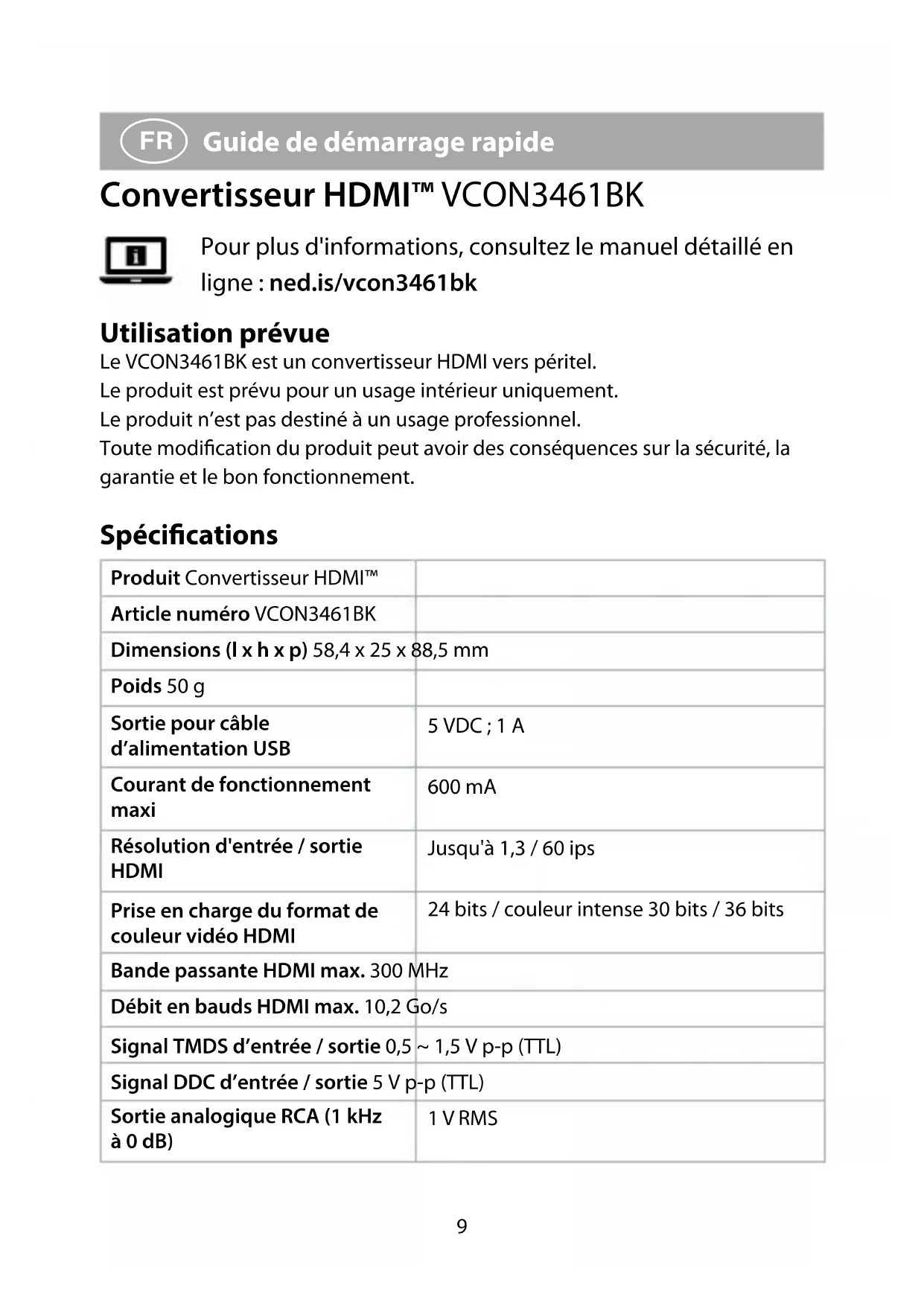 Guide de démarrage rapide Convertisseur HDMI™ VCON3461BK Pour plus d'informations, consultez le manuel détaillé en ligne : ned.is/vcon3461bk Utilisation prévue Le VCON3461BK est un convertisseur HDMI vers péritel. Le produit est prévu pour un usage intérieur uniquement. Le produit n’est pas destiné à un usage professionnel. Toute modication du produit peut avoir des conséquences sur la sécurité, la garantie et le bon fonctionnement. Spécications Produit Convertisseur HDMI™ Article numéro VCON3461BK Dimensions (l x h x p) 58,4 x 25 x 88,5 mm Poids 50 g Sortie pour câble d’alimentation USB 5 VDC ; 1 A Courant de fonctionnement maxi 600 mA Résolution d'entrée / sortie HDMI Jusqu'à 1,3 / 60 ips Prise en charge du format de couleur vidéo HDMI 24 bits / couleur intense 30 bits / 36 bits Bande passante HDMI max. 300 MHz Débit en bauds HDMI max. 10,2 Go/s Signal TMDS d’entrée / sortie 0,5 ~ 1,5 V p-p (TTL) Signal DDC d’entrée / sortie 5 V p-p (TTL) Sortie analogique RCA (1 kHz à 0 dB) 1 V RMS10 Rapport signal/bruit à dB (CC1R / ARM) ≥ 90 dB Distorsion ≤ 0,1 % Réponse en fréquence 20 Hz ~ 20000 Hz Longueur maximale du câble d'entrée HDMI Câble standard HDMI AWG26 ≤ 7 m Longueur maximale du câble de sortie Péritel Câble standard Péritel AWG26 ≤ 8 m Température fonctionnement -10 °C – 55 °C Température de stockage -20 °C – 60 °C Humidité en fonctionnement 10 - 90 % HR (sans condensation) Humidité de stockage 5 - 95 % HR (sans condensation) Pièces principales (image A)