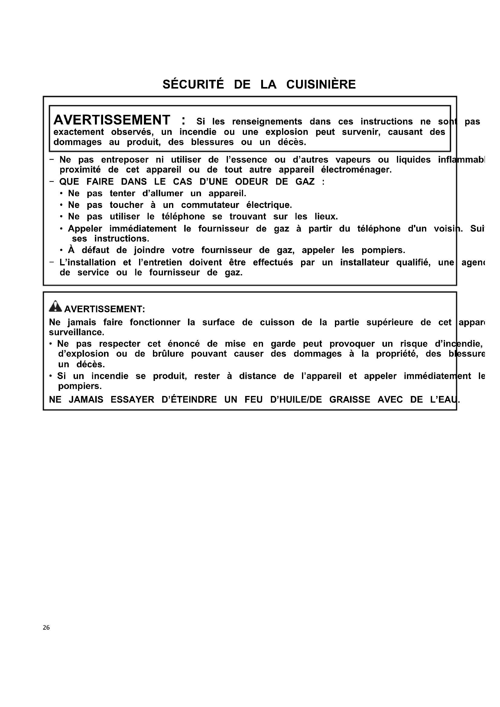 MISE EN GARDE : Ne pas ranger d’articles pouvant intéresser les enfants dans les armoires situées au-dessus d’une appareil ou sur dosseret de la appareil – les enfants grimpant sur la appareil pour atteindre des articles peuvent gravement se blesser. ■ Ne pas laisser les enfants seuls – Les enfants ne doivent pas être laissés seuls ou sans surveillance dans la zone où la appareil est utilisé. Ils ne doivent jamais être autorisés à s’asseoir ou à se tenir debout sur une partie quelconque de la appareil. ■ Porter des vêtements adaptés – Les vêtements pendants ou non ajustés ne doivent jamais être portés lorsqu’on utilise la cuisinière. ■ Ne pas utiliser d’eau sur les feux de friture – Étouffer le feu ou la flamme ou utiliser un extincteur avec agent chimique sec ou mousseux. ■ Entreposage dans ou sur la appareil – Les matières inflammables ne doivent pas être entreposées dans un four ou près de la surface de la table. ■ Cet appareil n’est pas conçu pour servir d’espace de rangement. ■ Entretien par l’utilisateur – Ne pas réparer ou remplacer une quelconque pièce de la appareil sans recommandation spécifique du manuel. Toutes les autres tâches d’entretien doivent être effectuées par un technicien qualifié. ■ Utiliser uniquement des mitaines sèches – Les mitaines humides ou trempées sur les surfaces chaudes peuvent provoquer des brûlures dues à la vapeur. Ne pas laisser les mitaines toucher des unités de surface et chauds. Ne pas utiliser un chiffon ou tout autre tissu encombrant. ■ Ne jamais laisser les surfaces de cuisson sans surveillance à des réglages de chaleur élevée – Les ébullitions provoquent de la fumée et des éclaboussures graisseuses qui peuvent s’enflammer. ■ Ustensiles de cuisson émaillés – seuls certains types d’ustensiles en verre, vitrocéramique, céramique, terre cuite ou autre émaillage peuvent être utilisés sur la surface de la cuisinière sans briser en raison du changement de température soudain. ■ Les poignées des ustensiles doivent être tournées vers l’intérieur et ne doivent pas dépasser au-dessus des unités de surface de cuisson – Pour éviter le risque de brûlures, d’inflammation des matières inflammables et d’éclaboussures dues à un contact non intentionnel avec l’ustensile, la poignée d’un ustensile doit toujours être positionnée vers l’intérieur et ne doit pas dépasser au- dessus des surfaces de cuisson adjacentes. ■ Déconnecter la source de courant électrique avant l’entretien. ■ Cet appareil est pourvu d’ une fiche à trois broches don't une mise à la terre assurant une protection contre les chocs électriques. La prise dans laaquelle elle est branchée doit être correctement mise à la terre. Ne pas couper ni enlever la broche de mise à la terre de la fiche. ■ Installation conforme – L’appareil, lors de son installation, doit être correctement relié à la terre en conformité avec les codes locaux en vigueur, ou en l’absence de tels codes, avec le National Electrical Code, ANSI/NFPA 70 ou le Code canadien des installations électriques, CSA C22.1-02. Au Canada, l’appareil doit être relié à la terre en respectant le Code canadien de l’électricité. S’assurer que l’appareil est bien installé et que la mise à la terre est réalisée par un technicien qualifié. ■ Des blessures peuvent résulter d’un mauvais usage des portes ou tiroirs de l’appareil – par exemple, marcher, s’appuyer ou s’asseoir sur les portes ou tiroirs. ■ Entretien – Maintenir la zone de la cuisinière à l’abri des matériaux combustibles, essence ou autres vapeurs ou liquides inflammables.