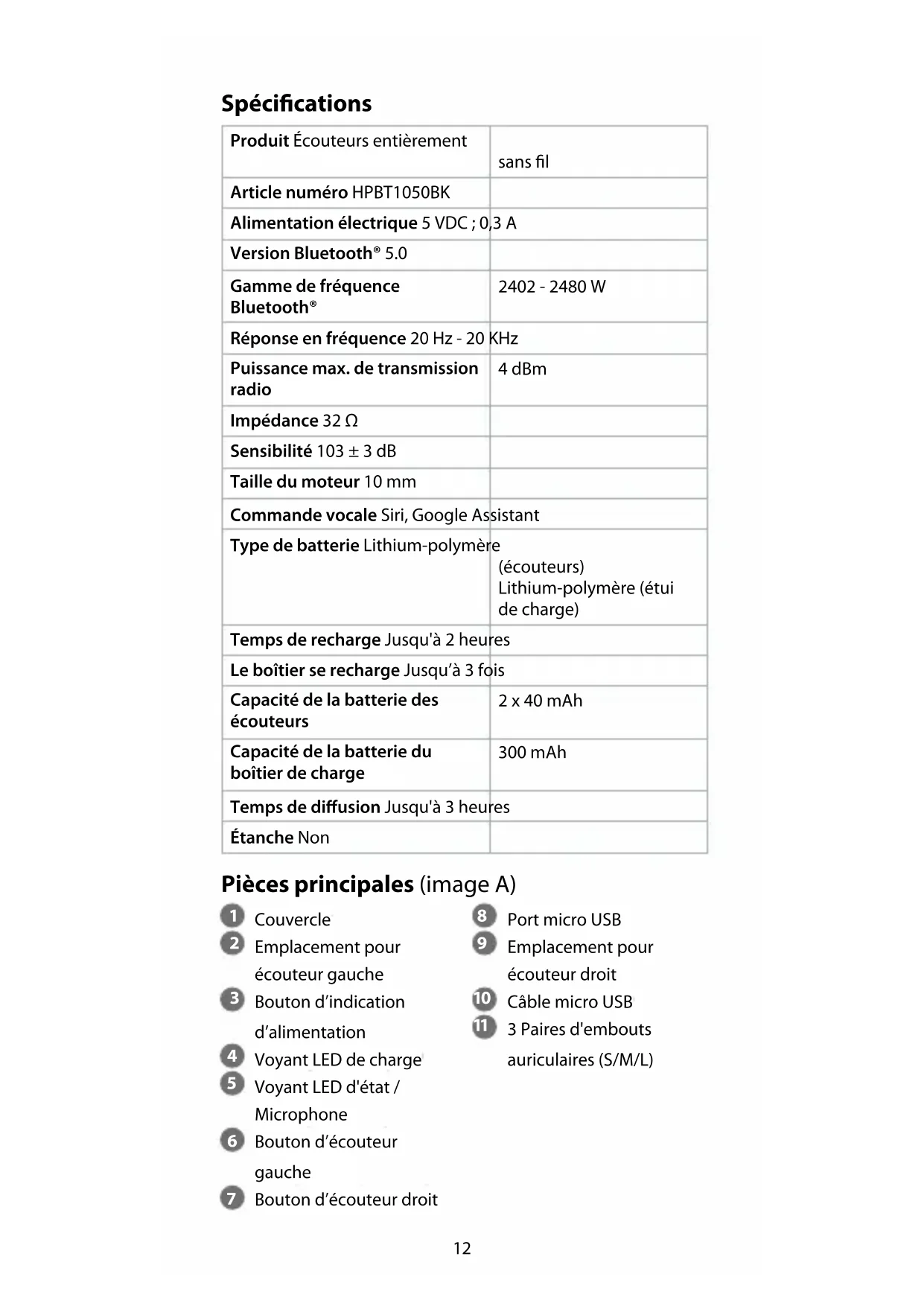Guide de démarrage rapide Écouteurs entièrement sans l HPBT1050BK Pour plus d'informations, consultez le manuel détaillé en ligne: ned.is/hpbt1050bk Utilisation prévue Les HPBT1050BK Nedis sont une paire d’écouteurs entièrement sans l. Le produit peut être appairé à n'importe quel appareil audio / vidéo compatible Bluetooth. Les écouteurs peuvent être rechargés jusqu'à 3 fois dans le boîtier de charge. Toute modication du produit peut avoir des conséquences sur la sécurité, la garantie et le bon fonctionnement.12 Spécications Produit Écouteurs entièrement sans l Article numéro HPBT1050BK Alimentation électrique 5 VDC ; 0,3 A Version Bluetooth® 5.0 Gamme de fréquence Bluetooth® 2402 - 2480 W Réponse en fréquence 20 Hz - 20 KHz Puissance max. de transmission radio 4 dBm Impédance 32 Ω Sensibilité 103 ± 3 dB Taille du moteur 10 mm Commande vocale Siri, Google Assistant Type de batterie Lithium-polymère (écouteurs) Lithium-polymère (étui de charge) Temps de recharge Jusqu'à 2 heures Le boîtier se recharge Jusqu’à 3 fois Capacité de la batterie des écouteurs 2 x 40 mAh Capacité de la batterie du boîtier de charge 300 mAh Temps de diusion Jusqu'à 3 heures Étanche Non Pièces principales (image A)