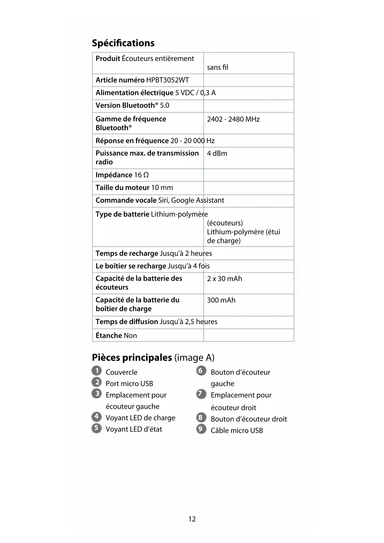 Guide de démarrage rapide Écouteurs entièrement sans l HPBT3052WT Pour plus d'informations, consultez le manuel détaillé en ligne : ned.is/hpbt3052wt Utilisation prévue Les HPBT3052WT Nedis sont une paire d’écouteurs entièrement sans l. Le produit peut être appairé à n'importe quel appareil audio / vidéo compatible Bluetooth. Les écouteurs peuvent être chargés jusqu'à 4 fois dans le boîtier entièrement chargé. Toute modication du produit peut avoir des conséquences sur la sécurité, la garantie et le bon fonctionnement.12 Spécications Produit Écouteurs entièrement sans l Article numéro HPBT3052WT Alimentation électrique 5 VDC / 0,3 A Version Bluetooth® 5.0 Gamme de fréquence Bluetooth® 2402 - 2480 MHz Réponse en fréquence 20 - 20000 Hz Puissance max. de transmission radio 4 dBm Impédance 16 Ω Taille du moteur 10 mm Commande vocale Siri, Google Assistant Type de batterie Lithium-polymère (écouteurs) Lithium-polymère (étui de charge) Temps de recharge Jusqu'à 2 heures Le boîtier se recharge Jusqu’à 4 fois Capacité de la batterie des écouteurs 2 x 30 mAh Capacité de la batterie du boîtier de charge 300 mAh Temps de diusion Jusqu'à 2,5 heures Étanche Non Pièces principales (image A)