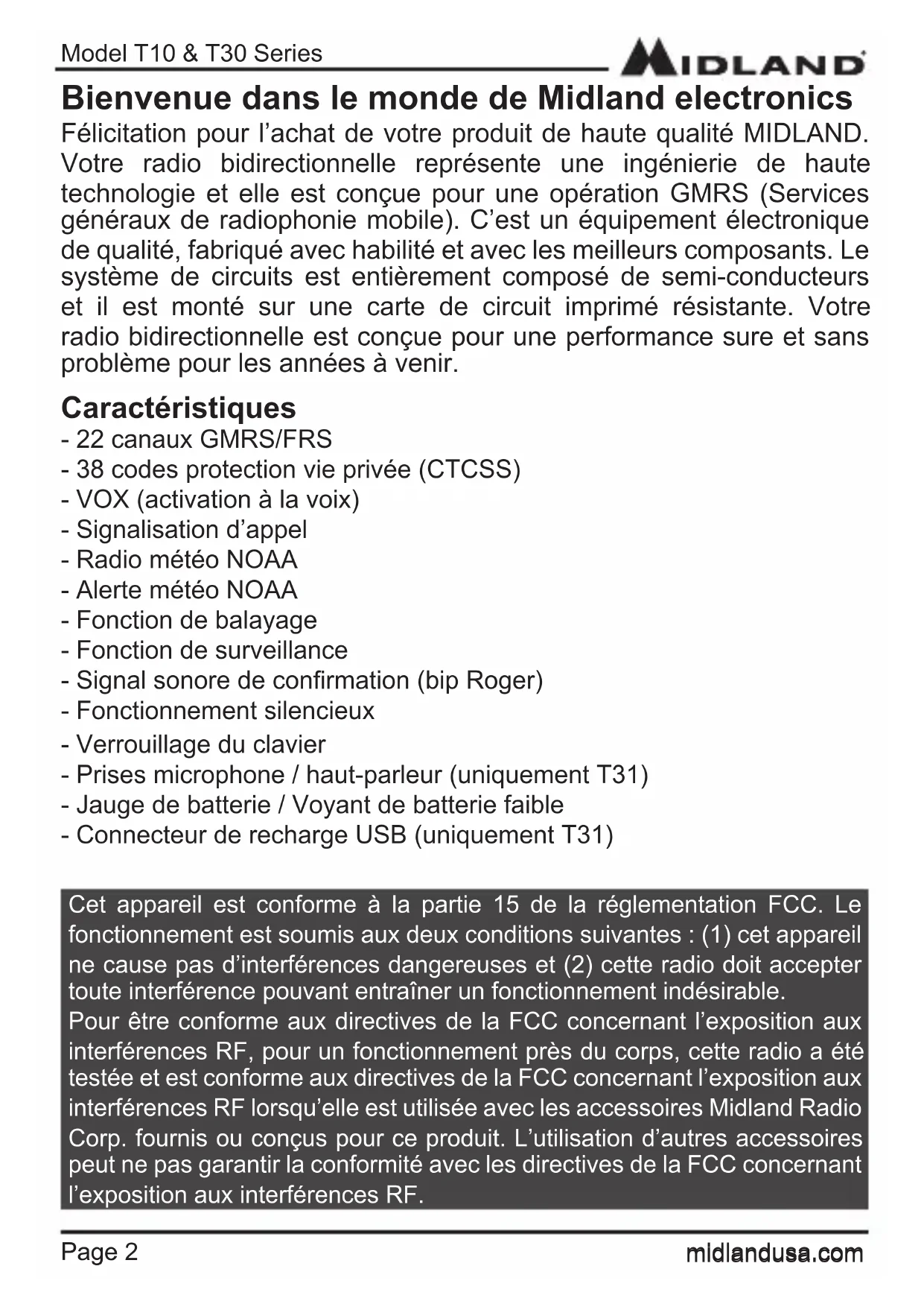 Model T10 & T30 Series Page 2 midlandusa.com Félicitation pour l’achat de votre produit de haute qualité MIDLAND. Votre radio bidirectionnelle représente une ingénierie de haute technologie et elle est conçue pour une opération GMRS (Services généraux de radiophonie mobile). C’est un équipement électronique de qualité, fabriqué avec habilité et avec les meilleurs composants. Le système de circuits est entièrement composé de semi-conducteurs et il est monté sur une carte de circuit imprimé résistante. Votre radio bidirectionnelle est conçue pour une performance sure et sans problème pour les années à venir. Bienvenue dans le monde de Midland electronics Caractéristiques - 22 canaux GMRS/FRS - 38 codes protection vie privée (CTCSS) - VOX (activation à la voix) - Signalisation d’appel - Radio météo NOAA - Alerte météo NOAA - Fonction de balayage - Fonction de surveillance - Signal sonore de conrmation (bip Roger) - Fonctionnement silencieux - Verrouillage du clavier - Prises microphone / haut-parleur (uniquement T31) - Jauge de batterie / Voyant de batterie faible - Connecteur de recharge USB (uniquement T31) Cet appareil est conforme à la partie 15 de la réglementation FCC. Le fonctionnement est soumis aux deux conditions suivantes : (1) cet appareil ne cause pas d’interférences dangereuses et (2) cette radio doit accepter toute interférence pouvant entraîner un fonctionnement indésirable. Pour être conforme aux directives de la FCC concernant l’exposition aux interférences RF, pour un fonctionnement près du corps, cette radio a été testée et est conforme aux directives de la FCC concernant l’exposition aux interférences RF lorsqu’elle est utilisée avec les accessoires Midland Radio Corp. fournis ou conçus pour ce produit. L’utilisation d’autres accessoires peut ne pas garantir la conformité avec les directives de la FCC concernant l’exposition aux interférences RF. Page midlandusa.comModel T10 & T30 Series Page 3 midlandusa.com NOTE IMPORTANTE, LA LICENCE FCC EST REQUISE POUR L’UTILISATION GMRS (Applicable uniquement pour utilisation de radio GMRS aux Etats-Unis) Les radios fonctionnent sur les fréquences GMRS (Services généraux de radiophonie mobile) qui nécessitent une licence FCC (Commission fédérale des communications). Vous devez obtenir cette licence avant d’utiliser les canaux 1 - 7 ou 15 - 22, ce qui comprend les canaux GMRS de ces radios. Une utilisation sans licence des canaux GMRS pourrait résulter en des sanctions sévères, en violation des règles FCC, comme stipulé dans les Lois sur la Communication sections 501 et 502 (révisées). Un indicatif d’appel vous sera délivré par la FCC et il devra être utilisé comme identication de station lorsque vous utilisez votre radio sur des canaux GMRS. Vous devriez également coopérer en engageant uniquement des transmissions autorisées, évitant un brouillage de canal avec d’autres utilisateurs GMRS, et en étant prudent quant à la durée de votre transmission. Pour obtenir une licence or adresser des questions concernant la demande de licence, contacter la FCC au 1-888-CALL FCC ou se rendre sur le site internet de la FCC : http://www.fcc.gov et demander le formulaire 605. Exposition à l’énergie de radiofréquence. Votre Radio Midland radio est conçue pour être conforme aux standards et directives nationaux et internationaux suivant concernant l’exposition d’êtres humains à l’énergie électromagnétique de radiofréquence : – Commission fédérale des communications des Etats-Unis, Code des règlements fédéraux : 47 CFR partie 2 sous-partie J – Organisme américain de normalisation (ANSI) / Institut des ingénieurs électriques et électroniques (IEEE) C95. 1-1992 – Institut des ingénieurs électriques et électroniques (IEEE) C95. Edition 1-1999 – Conseil national sur la protection contre les rayonnements et leurs mesures (NCRP) des Etats-Unis, Rapport 86, 1986 – Commission internationale pour la protection contre les rayonnements non ionisants (ICNIRP) 1998 An de contrôler votre exposition et être en conformité avec la population générale ou les limites de l’exposition d’un environnement non contrôlé, ne pas transmettre plus de 50 % du temps. La radio ne génère une exposition mesurable d’énergie RF que lorsqu’elle transmet. Utilisation près du corps Si vous portez la radio sur votre corps lorsqu’elle transmet, toujours utiliser un clip ceinture, un étui, un boîtier ou un harnais corporel fournit par Midland ou approuvé pour ce produit. L’utilisation de tout autre accessoire non fourni ou approuvé par Midland peut excéder l’exposition RF mentionnée dans les directives de FCC/Santé Canada. Si vous n’utilisez aucun des accessoires fournis ou approuvés par Midland, s’assurer que la radio et son antenne soient à au moins 2,5 cm (1 pouce) de votre corps lorsqu’elle transmet.Model T10 & T30 Series Page 4 midlandusa.com ECRAN LCD COMMANDES