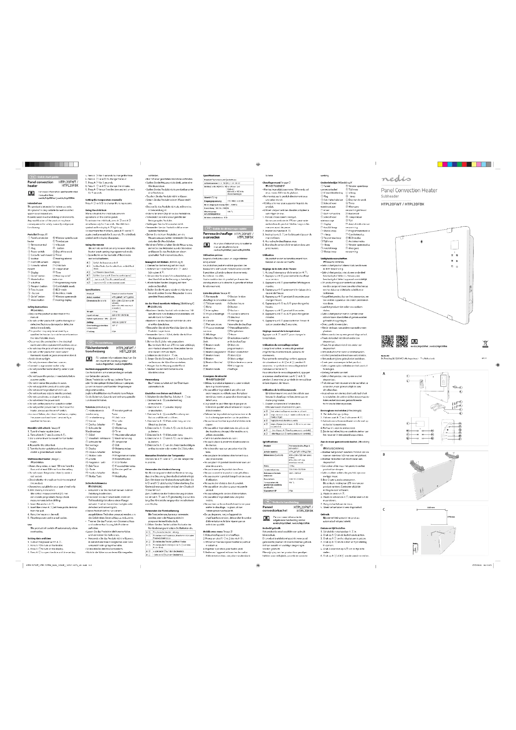 Guide de démarrage rapide Panneau de chauffage à convection HTPL20FWT / HTPL20FBK Pour plus d'informations, consultez le manuel détaillé en ligne : ned.is/htpl20fwt | ned.is/htpl20fbkUtilisation prévueLe produit est prévu pour un usage intérieur uniquement.Ce produit ne peut être utilisé que dans des locaux bien isolés ou de manière occasionnelle.Il peut être utilisé dans des environnements humides et mouillés.Toute modication du produit peut avoir des conséquences sur la sécurité, la garantie et le bon fonctionnement.Liste des pièces [Image A] Panneau de chauage à convection Télécommande Fiche Interrupteur Vis pour montage mural Cheville Pied avec roues Vis pour montage sur roue Achage Bouton Marche/Arrêt Bouton mode Bouton + Bouton programme Bouton heure Bouton - Bouton Marche/Arrêt Bouton mode Bouton fenêtre ouverte Bouton heure Bouton + Bouton - Jour de la semaine Minuteur Achage de l’intervalle de chauage Verrouillage enfant Température Heure Indication marche/arrêt du chauage Mode de programmation Mode confortable Mode ÉCO Mode antigel Mode fenêtre ouverte Achage du chauageConsignes de sécurité - AVERTISSEMENT• Utilisez le produit uniquement comme décrit dans le présent manuel.• Ne pas utiliser le produit si une pièce est endommagée ou défectueuse. Remplacer immédiatement un appareil endommagé ou défectueux.• Ce produit ne peut être réparé que par un technicien qualié an de réduire les risques d'électrocution.• Débrancher le produit de la prise secteur et de tout autre équipement en cas de problème.• Ne pas laisser tomber le produit et éviter de le cogner.• Ne pas utiliser le produit dans des pièces où des liquides ou des gaz inammables sont utilisés ou stockés.• Évitez la lumière directe du soleil.• Ne pas le placer à proximité d’autres sources de chaleur.• Ne le brancher que sur une prise mise à la terre.• Ne pas placer le radiateur directement sous une prise murale.• Ne pas placer le produit directement sous une prise de courant.• Ne pas immerger le produit dans l’eau.• Ne pas soumettre le produit à des jets d’eau.• Ne pas couvrir le produit lorsqu’il est en cours d’utilisation.• Ne pas insérer d’objets dans le produit.• Ne pas utiliser de solvants pour nettoyer le produit.• Ne pas rallonger le cordon d’alimentation.• Ne pas utiliser le produit dans une prise mobile.• Ne pas tirer sur le cordon d’alimentation pour arrêter le chauage. Toujours utiliser l’interrupteur marche/arrêt.• En cas de panne, mettre l’appareil de chauage hors tension, débrancher le cordon d’alimentation et le faire réparer par un technicien qualié.Mobile avec roues [Image B]1. Retournez l’appareil de chauage.2. Prenez un pied A et 2 des vis A