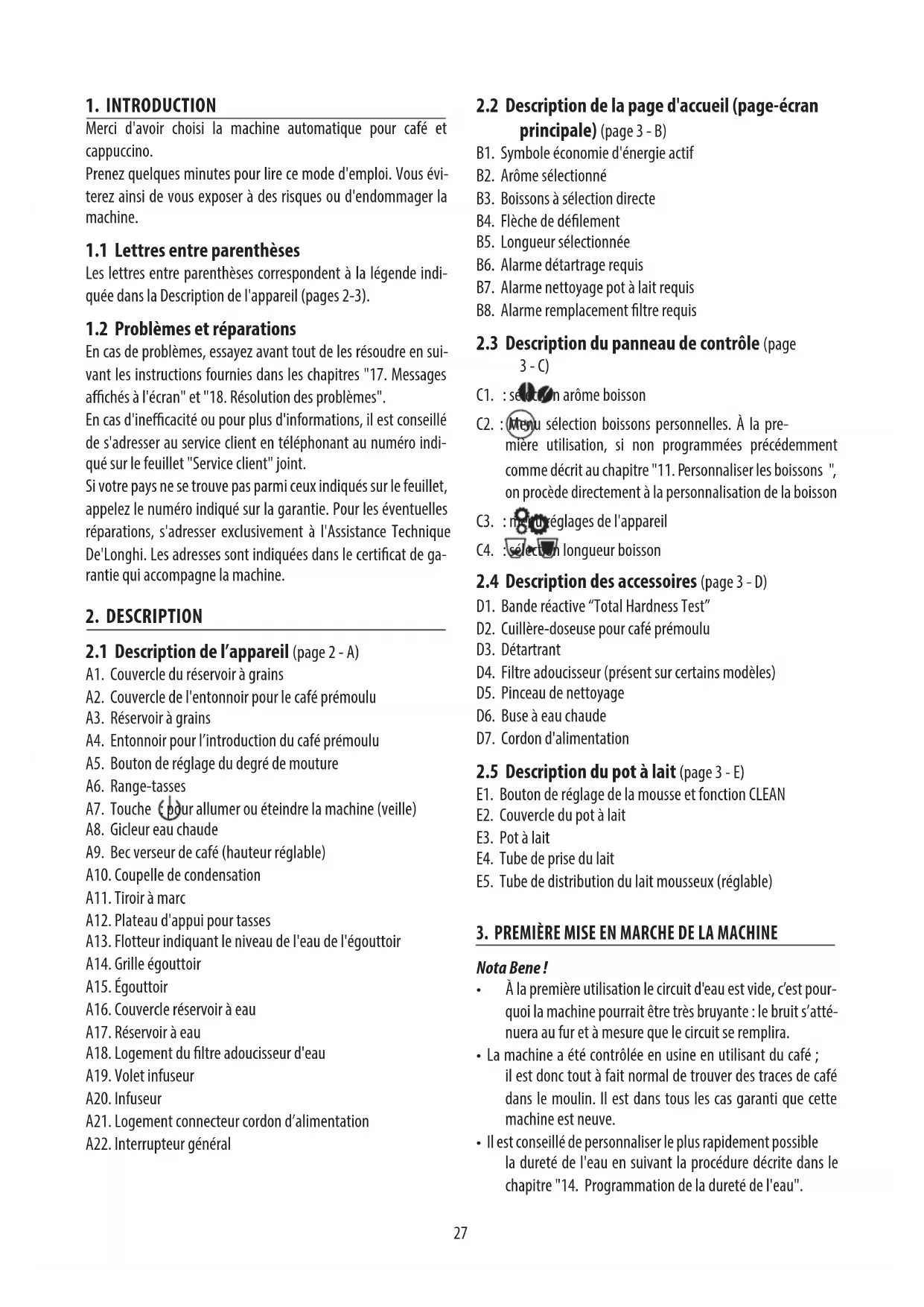 Nota Bene ! • À la première utilisation de la machine, il faut faire 4 - 5 cappuccinos avant d’obtenir un résultat satisfaisant.• Durant la préparation des 4 - 5 premiers cappuccinos, il est normal d'entendre un bruit d'eau en ébullition : par la suite le bruit s’atténuera.• Pour obtenir des performances optimales de la machine, nous conseillons d’installer le ltre adoucisseur (D7) en suivant les indications du chapitre "15. Filtre adoucisseur". Si le modèle n’est pas fourni avec le ltre, il est possible de le demander aux centres d’assistance agréés De’Longhi.