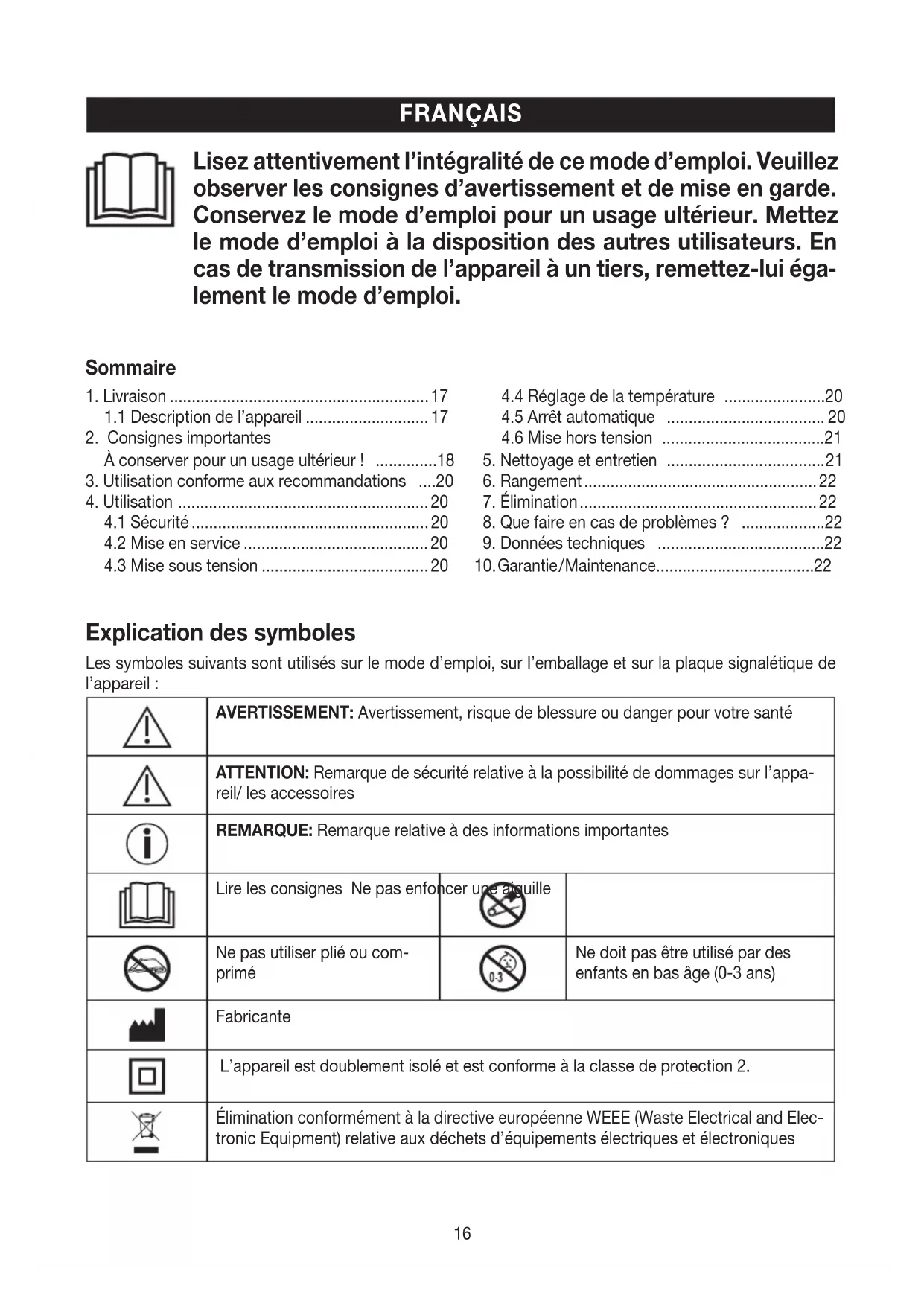 Further information on the guarantee and guarantee conditions can be found in the guarantee leaflet supplied. Subject to errors and changes16 FRANÇAIS Sommaire Explication des symboles Les symboles suivants sont utilisés sur le mode d’emploi, sur l’emballage et sur la plaque signalétique de l’appareil: