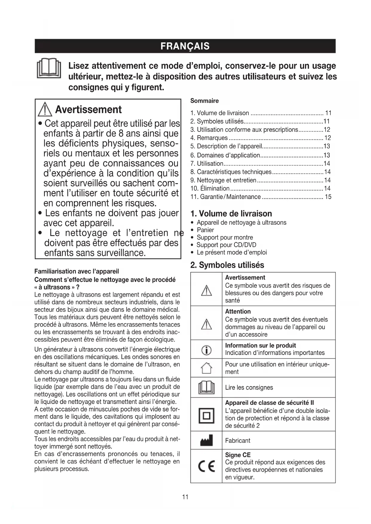 Appareil de nettoyage à ultra-sons Mode d’emploi ................................ 11