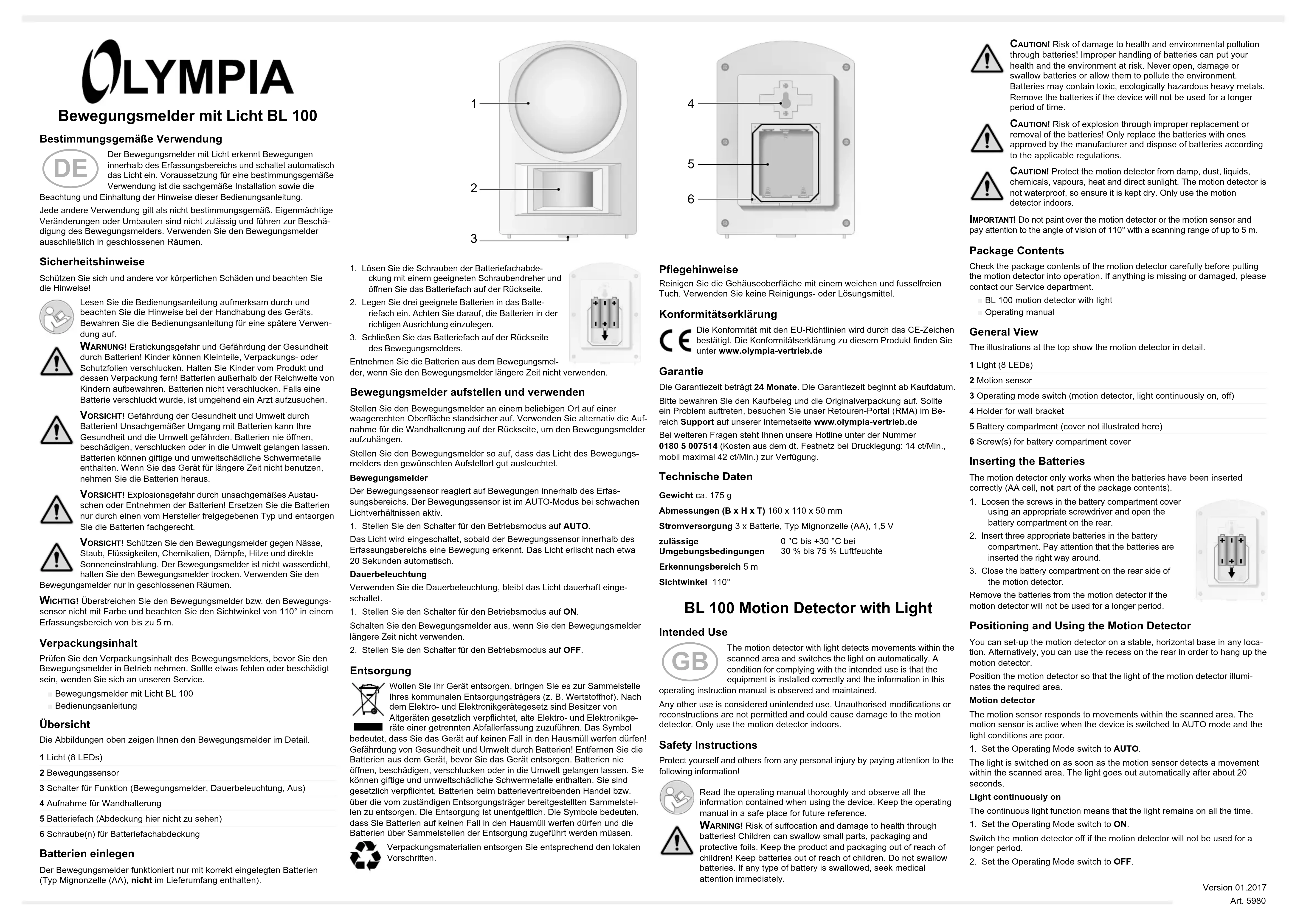 Élimination Si vous ne voulez plus vous servir de votre appareil, veuillez l’apporter au centre de collecte de l’organisme d’élimination des déchets de votre commune (par ex. centre de recyclage). D’après la loi relative aux appareils électriques et électro- niques, les propriétaires d’appareils usagés sont tenus d’apporter tous les anciens appareils électriques et électroniques dans un collecteur séparé. L’icône ci-contre signie que vous ne devez en aucun cas jeter votre appareil dans les ordures ménagères ! Mise en danger de l’homme et pollution de l’environnement causées par les piles ! Retirez les piles de l’appareil avant de l’éliminer. Ne jamais ouvrir, endommager, avaler les piles ou ne jamais faire pénétrer leur contenu dans l’environnement. Elles peuvent contenir des métaux lourds toxiques et nuisibles pour celui-ci. Vous êtes tenu par la loi d’éliminer les piles en les déposant chez un revendeur ou en les déposant dans les collecteurs correspondants de l’organisme d’élimination des déchets local. L’élimination des piles est gratuite. Les symboles signient que vous ne devez en aucun cas jeter les piles et piles rechargeables dans les ordures ménagères, mais que vous devez les apporter à un centre de collecte. Éliminez les matériaux d’emballage conformément aux réglemen- tations locales. Conseils d’entretien Nettoyez la surface du boîtier avec un chiffon doux et non pelucheux. N’utili- sez pas de produits d’entretien ni de solvants. Déclaration de conformité Le marquage CE conrme la conformité aux directives UE. Vous trouverez la déclaration de conformité de ce produit sur www.olympia-vertrieb.de. Garantie Cher client, nous sommes très heureux que vous ayez choisi cet appareil. En cas de défaut, veuillez retourner l’appareil dans son emballage d’origine et accompagné du bon d’achat au magasin où vous l’avez acheté. Données techniques Poids env. 175 g Dimensions (l x H x E) 160 x 110 x 50 mm Alimentation en courant 3 piles cellules Mignon AA, 1,5 V Conditions ambiantes tolérées 0 °C à +30 °C avec 30 % à 75 % d'humidité relative Plage de détection 5 m Angle de vision 110° Rilevatore di movimenti con luce BL 100 Impiego conforme agli usi previsti