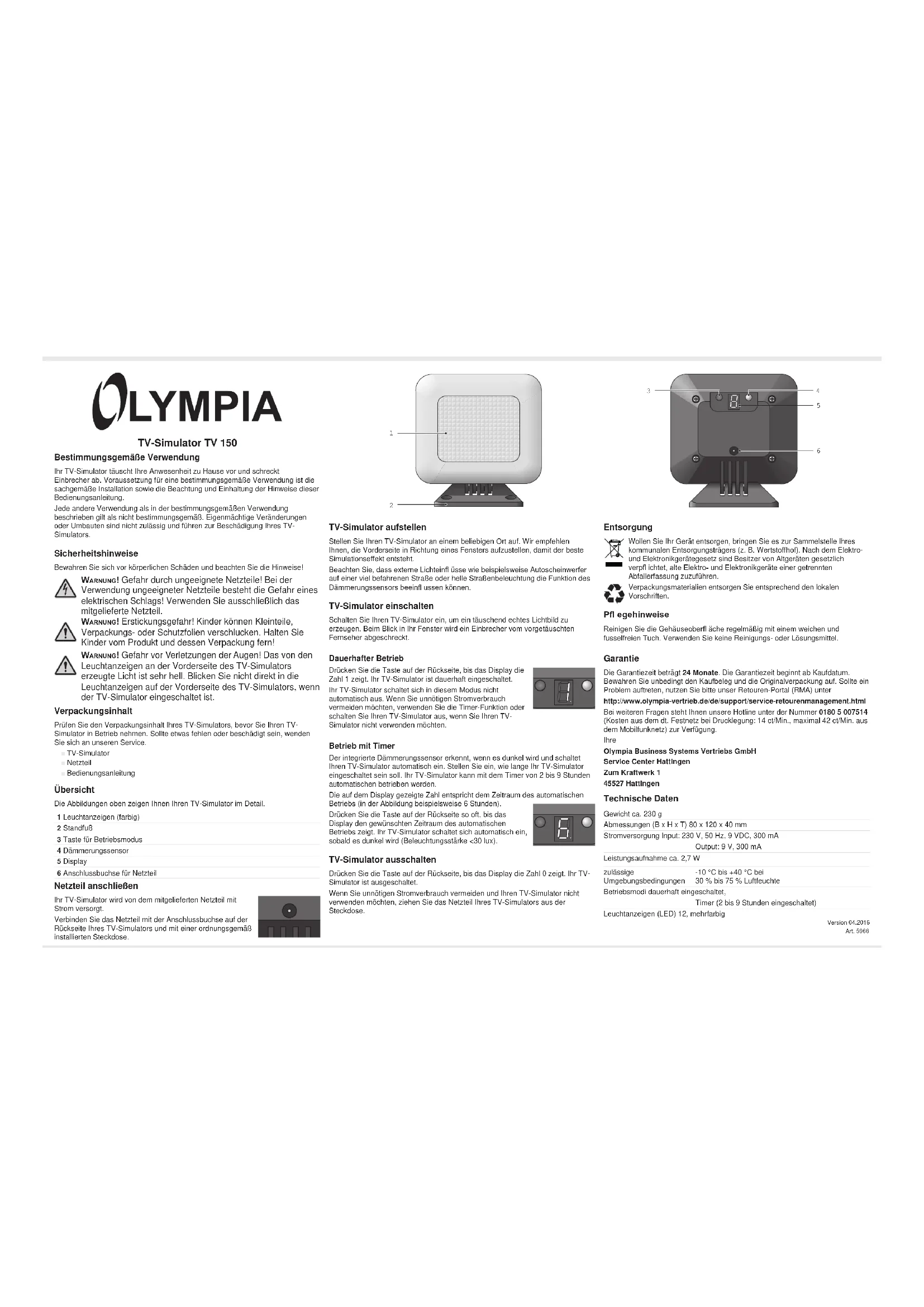 6Version 04.2016Art. 5966 Utilisation conforme à l'usage prévu Le simulateur de télévision dissuade les intrus d'entrer dans votre habitation en leur faisant croire qu'elle est occupée. L'utilisation conforme à l'usage prévu re- quiert un montage approprié ainsi que l'observation des indications mentionnées dans le présent mode d'emploi. Toute utilisation autre que celle décrite au point Utilisation conforme à l'usage prévu est considérée comme non conforme. Des modifi cations ou transformations effectuées d'un propre gré sont interdites et conduisent à un endommagement du simulateur de télévision. Consignes de sécurité Préservez-vous de dommages corporels et tenez compte des remarques ! AVERTISSEMENT ! Risque lié à des blocs d'alimentation inappro- priés ! Risque d'électrocution par exemple ! N'utilisez que le bloc d'alimentation fourni. AVERTISSEMENT ! Risque d'étouffement ! Les enfants peuvent avaler des petits objets, des fi lms d'emballage ou de protec- tion. Tenez les enfants à l'écart du produit et de son embal- lage ! AVERTISSEMENT ! Risque de blessure oculaire ! La lumière produite par les voyants sur la face avant du simulateur de télévision est très vive. Ne regardez donc pas directement dedans quand le simulateur est allumé. Contenu de l'emballage Contrôlez le contenu de l'emballage de votre simulateur de télévision avant de faire fonctionner celui-ci. Veuillez vous adresser à notre service après-vente au cas où une pièce manque ou soit endommagée. ■ Simulateur de télévision ■ Bloc d'alimentation ■ Mode d'emploi Tableau Les illustrations dans la partie supérieure vous montre les détails du simulateur. 1 Voyants (de différentes couleurs) 2 Support 3 Touche mode de fonctionnement 4 Capteur de crépuscule 5 Écran 6 Prise alimentation bloc d'alimentation Raccorder le bloc d'alimentation Le bloc d'alimentation fourni alimente le simulateur en cou- rant. Raccordez le bloc d'alimentation à la douille située au dos du simulateur et à une prise de courant installée de façon réglementaire. Placer le simulateur de télévision Placez votre simulateur à un endroit quelconque. Nous conseillons de placer la face avant en direction d'une fenêtre afi n d'obtenir le meilleur effet de simulation. Veuillez noter que des lumières extérieures telles que les phares de voitures dans une rue très passagère ou l'éclairage des voies publiques peuvent infl uer sur la fonction du capteur de luminosité. Allumer le simulateur de télévision Allumez votre simulateur pour produire une image imitant parfaitement une vraie. En regardant par votre fenêtre, l'intrus sera dissuadé par la télévision simulée. Fonctionnement continu Appuyez sur la touche au dos jusqu'à ce que l'écran affi che le chiffre 1. Votre simulateur de télévision est allumé en perma- nence. Dans ce mode, il ne se s'éteint pas automatiquement. Si vous désirez éviter une consommation de courant inutile, utilisez la fonction minuterie ou débranchez votre simulateur quand vous ne l'utilisez pas. Fonctionnement avec minuterie Le capteur de crépuscule intégré détecte quand la nuit tombe et allume le si- mulateur automatiquement. Réglez la durée de fonctionnement automatique du simulateur avec minuterie. Celle-ci peut s'étendre de 2 à 9 heures. Le chiffre affi ché sur l'écran correspond à la durée du fonctionnement automatique (par exemple 6 heures, comme le montre l'illustration). Appuyez sur la touche au dos jusqu'à ce que l'écran affi che la durée voulue du fonctionnement automatique. Votre simu- lateur de télévision s'allume dès que la nuit tombe (intensité lumineuse <30 lux). Éteindre le simulateur de télévision Appuyez sur la touche au dos jusqu'à ce que l'écran affi che le chiffre 0. Votre simulateur s'éteint. Si vous désirez éviter une consommation de courant inutile ou ne pas utiliser votre simulateur, retirez le bloc d'alimentation de la prise. Élimination Si vous ne voulez plus vous servir de votre appareil, veuillez l'apporter au centre de collecte de l'organisme d'élimination des déchets de votre commune (par ex. centre de recyclage). D'après la loi relative aux appa- reils électriques et électroniques, les propriétaires d'appareils usagés sont tenus d'apporter tous les anciens appareils électriques et électroniques dans un collecteur séparé. Éliminez les matériaux d'emballage conformément aux réglementations locales. Conseils d'entretien Nettoyez régulièrement la surface du boîtier avec un chiffon doux et non pelu- cheux. N'utilisez pas de produits d'entretien ni de solvants. Garantie Cher client, nous sommes très heureux que vous ayez choisi cet appareil. En cas de défaut, veuillez retourner l’appareil dans son emballage d’origine et accompagné du bon d’achat au magasin où vous l’avez acheté. Caractéristiques techniques Poids env. 230 g Dimensions (l x H x P) 80 x 120 x 40 mm Alimentation en courant Entrée : 230 V / 50 Hz / 300 mA Sortie : 9 V, 300 mA Puissance absorbée env. 2,7 W Conditions ambiantes tolérées -10 °C à +40 °C avec 30 % à 75 % d'humidité relative Modes de fonctionnement en continu, Minuterie (2 à 9 heures allumé) Voyants (LED) 12, de différentes couleurs Simulateur de télévision TV 150