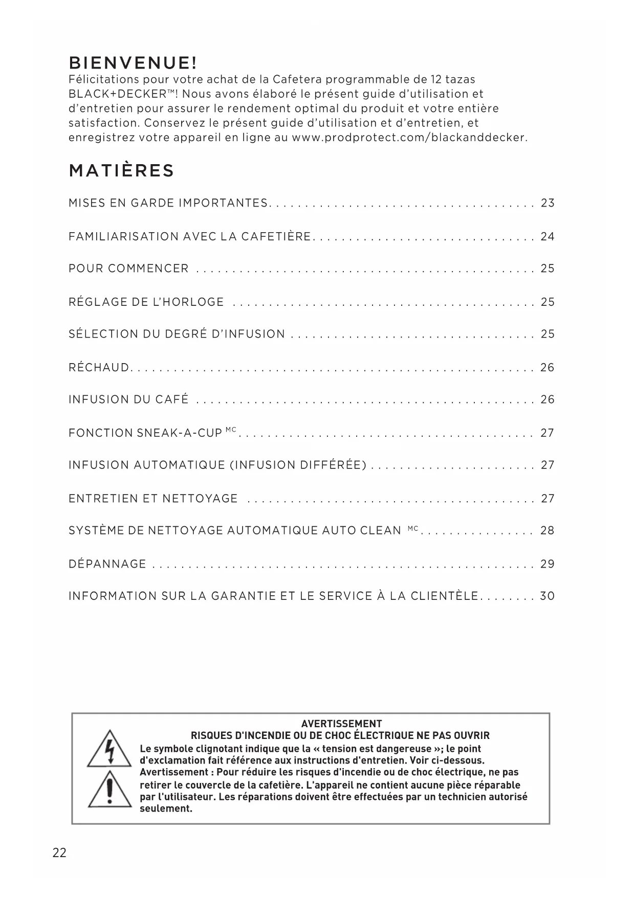 retirer le couvercle de la cafetière. L'appareil ne contient aucune pièce réparable par l'utilisateur. Les réparations doivent être effectuées par un technicien autorisé seulement. BIENVENUE! Félicitations pour votre achat de la Cafetera programmable de 12 tazas BLACK+DECKER™! Nous avons élaboré le présent guide d’utilisation et d’entretien pour assurer le rendement optimal du produit et votre entière satisfaction. Conservez le présent guide d’utilisation et d’entretien, et enregistrez votre appareil en ligne au www.prodprotect.com/blackanddecker. MATIÈRES