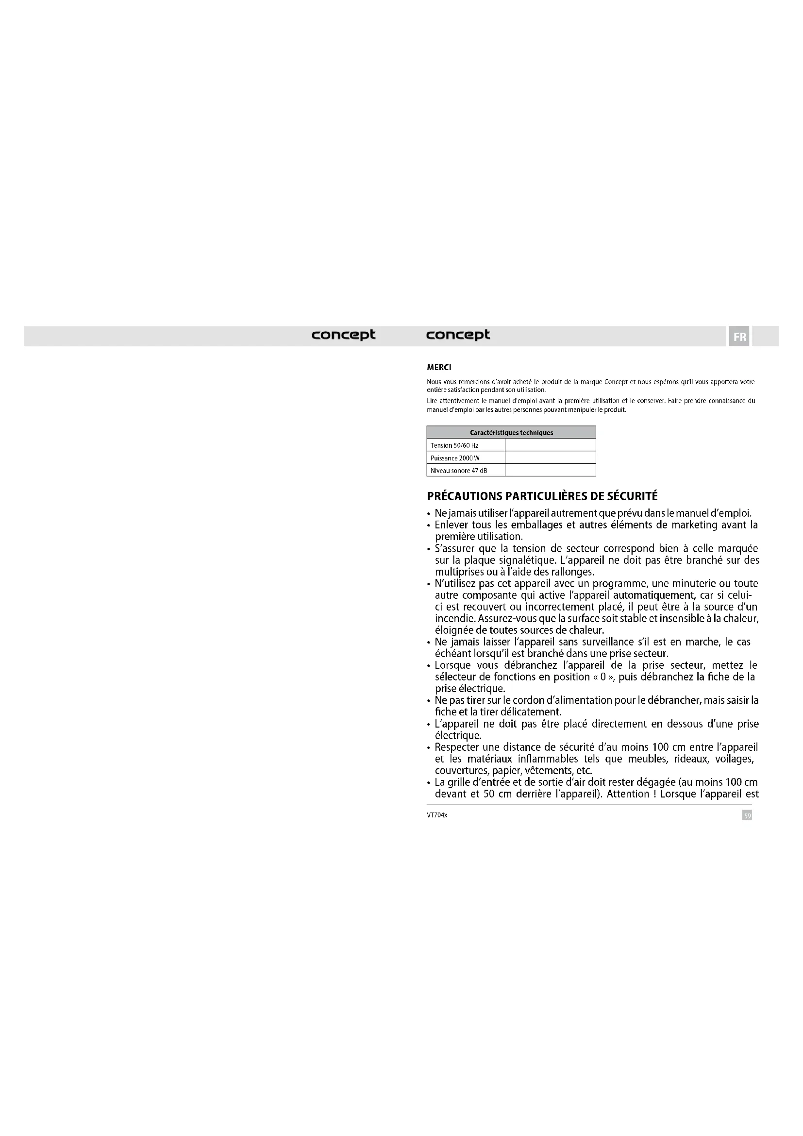 VT704x MERCI Nous vous remercions d’avoir acheté le produit de la marque Concept et nous espérons qu’il vous apportera votre entière satisfaction pendant son utilisation. Lire attentivement le manuel d’emploi avant la première utilisation et le conserver. Faire prendre connaissance du manuel d’emploi par les autres personnes pouvant manipuler le produit. Caractéristiques techniques Tension 50/60 Hz Puissance 2000 W Niveau sonore 47 dB PRÉCAUTIONS PARTICULIÈRES DE SÉCURITÉ
