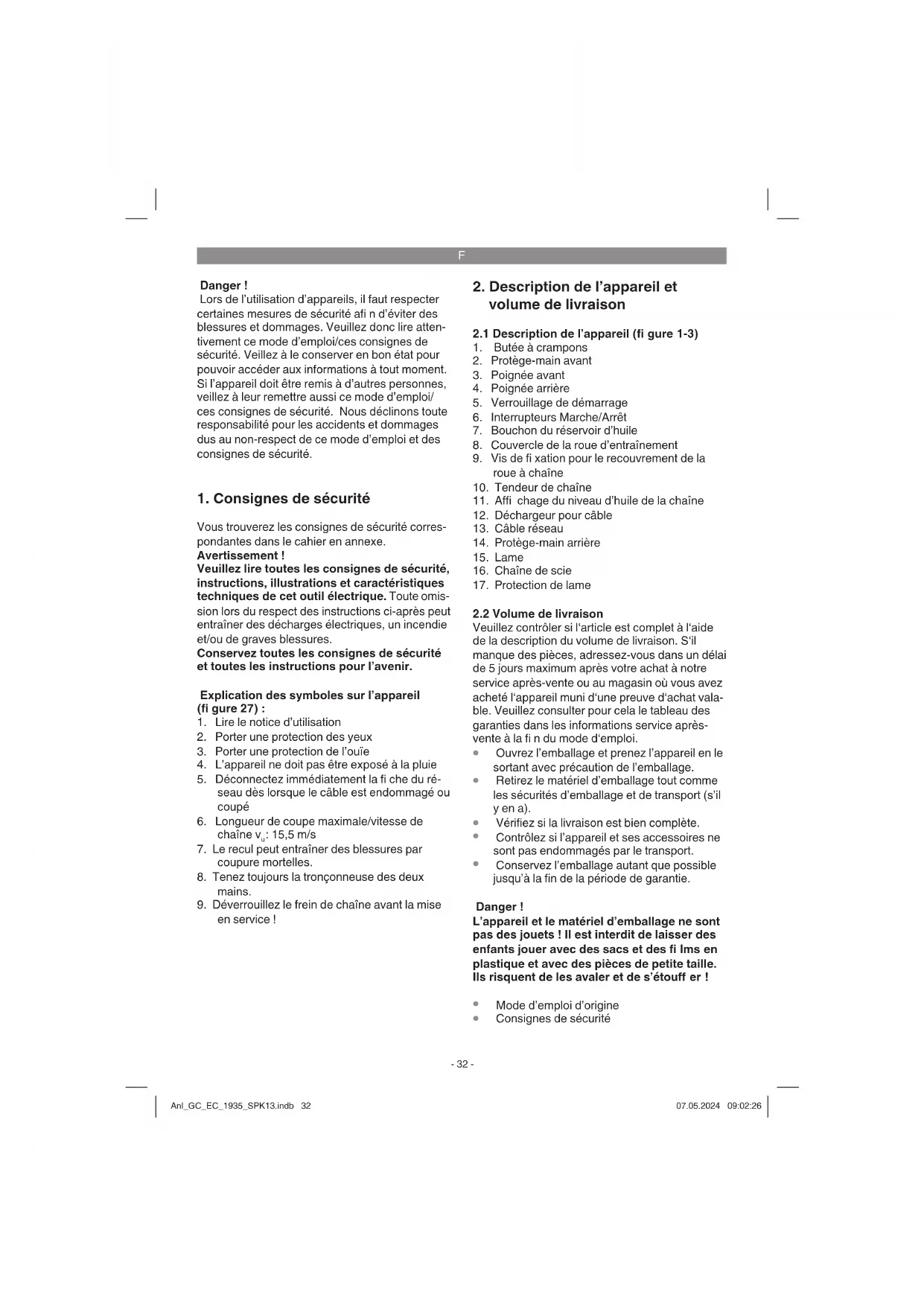 Avant toute utilisation, vérifi ez les points suivants afi n de travailler en toute sécurité : Etat de la scie à chaîne Avant de commencer à travailler, contrôlez la scie à chaîne et vérifi ez que le boîtier, le câble réseau, Anl_GC_EC_1935_SPK13.indb 35Anl_GC_EC_1935_SPK13.indb 35 07.05.2024 09:02:2707.05.2024 09:02:27F