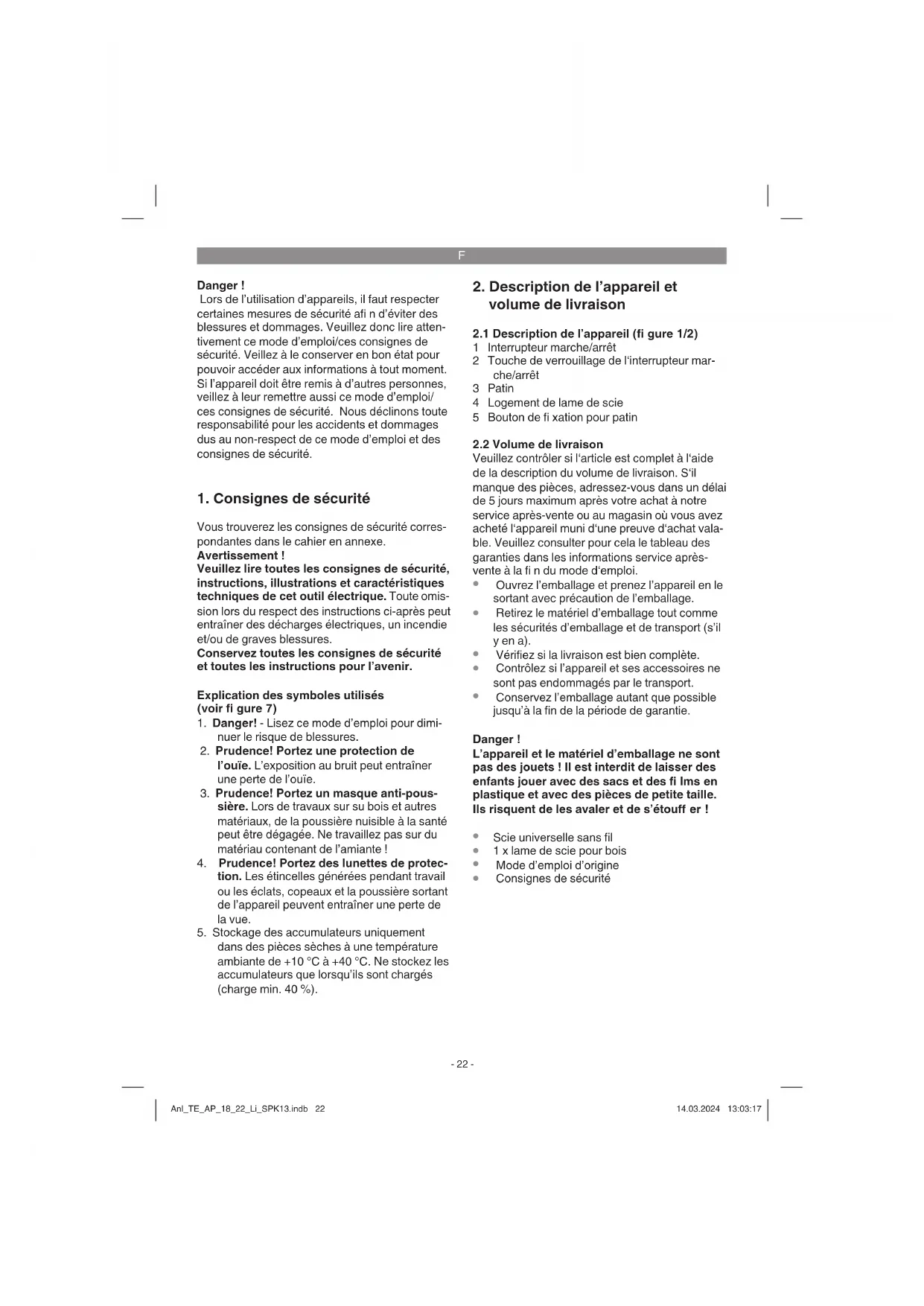 Mettez l’appareil hors circuit lorsque vous ne l’utilisez pas. Prudence ! Risques résiduels Même en utilisant cet outil électrique confor- mément aux prescriptions, il reste toujours des risques résiduels. Les dangers suivants peuvent apparaître en rapport avec la const- ruction et le modèle de cet outil électrique : Anl_TE_AP_18_22_Li_SPK13.indb 23Anl_TE_AP_18_22_Li_SPK13.indb 23 14.03.2024 13:03:1814.03.2024 13:03:18F