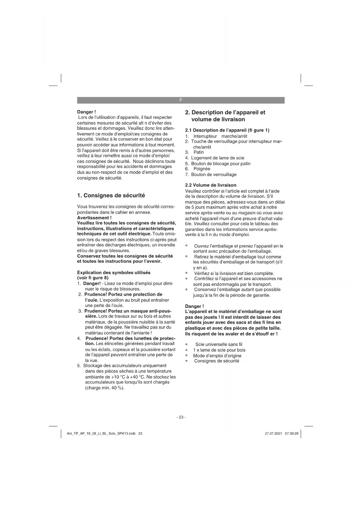 (fi g. 4/pos. f) Appuyez sur le bouton indicateur de charge de l‘accumulateur (g). L‘indicateur de charge de l‘accumulateur (f) vous indique l‘état d‘autonomie de l‘accumulateur à l‘aide de trois voyants LED Anl_TP_AP_18_28_Li_BL_Solo_SPK13.indb 25Anl_TP_AP_18_28_Li_BL_Solo_SPK13.indb 25 27.07.2021 07:39:2927.07.2021 07:39:29F