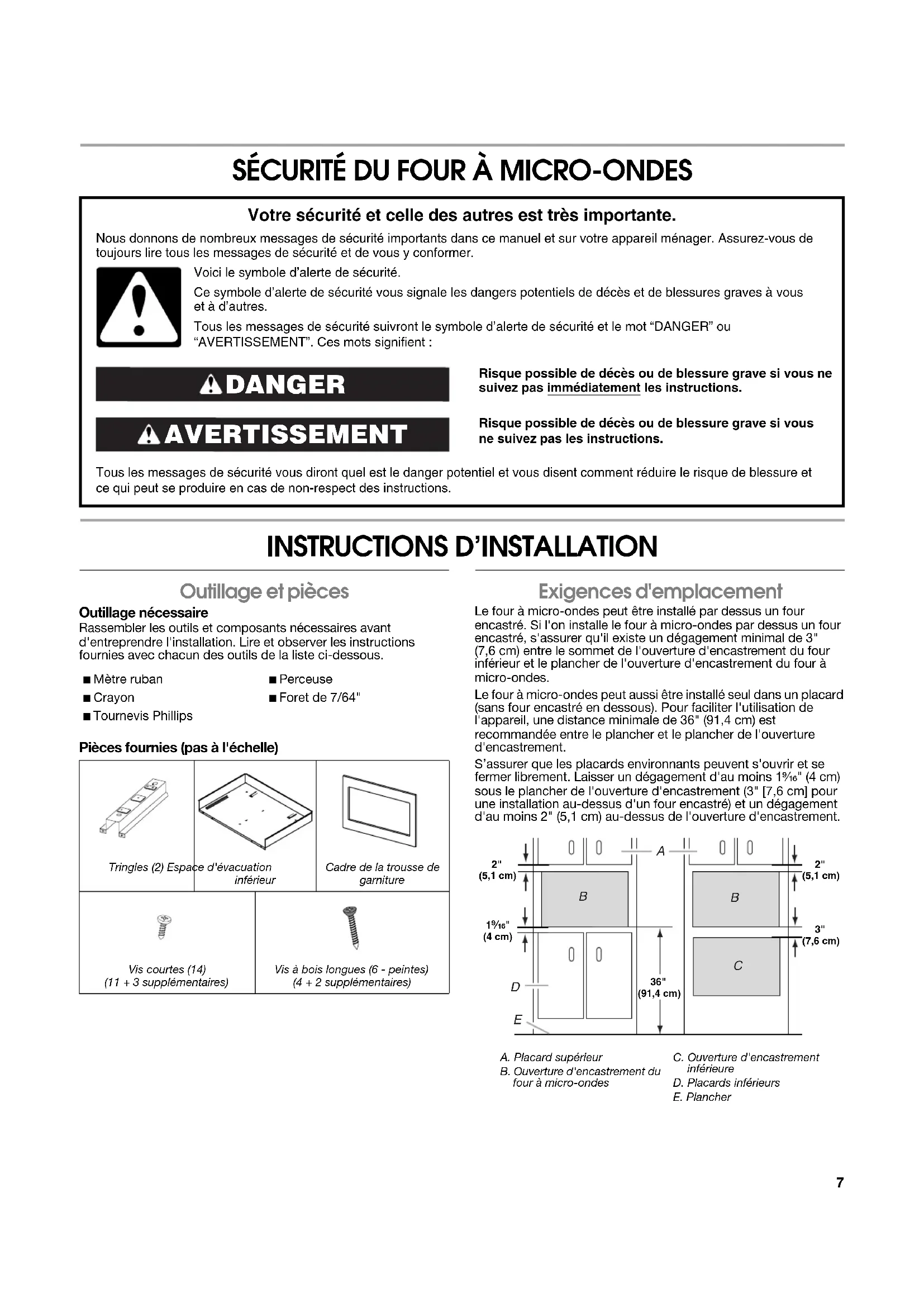 Outillage et pièces Outillage nécessaire Rassembler les outils et composants nécessaires avant d'entreprendre l'installation. Lire et observer les instructions fournies avec chacun des outils de la liste ci-dessous. Pièces fournies (pas à l'échelle) Exigences d'emplacement Le four à micro-ondes peut être installé par dessus un four encastré. Si l'on installe le four à micro-ondes par dessus un four encastré, s'assurer qu'il existe un dégagement minimal de 3" (7,6 cm) entre le sommet de l'ouverture d'encastrement du four inférieur et le plancher de l'ouverture d'encastrement du four à micro-ondes. Le four à micro-ondes peut aussi être installé seul dans un placard (sans four encastré en dessous). Pour faciliter l'utilisation de l'appareil, une distance minimale de 36" (91,4 cm) est recommandée entre le plancher et le plancher de l'ouverture d'encastrement.S’assurer que les placards environnants peuvent s'ouvrir et se fermer librement. Laisser un dégagement d'au moins 1⁹⁄₁₆" (4 cm) sous le plancher de l'ouverture d'encastrement (3" [7,6 cm] pour une installation au-dessus d'un four encastré) et un dégagement d'au moins 2" (5,1 cm) au-dessus de l'ouverture d'encastrement. Risque possible de décès ou de blessure grave si vous ne suivez pas immédiatement les instructions. Risque possible de décès ou de blessure grave si vous ne suivez pas les instructions. Tous les messages de sécurité vous diront quel est le danger potentiel et vous disent comment réduire le risque de blessure et ce qui peut se produire en cas de non-respect des instructions. Votre sécurité et celle des autres est très importante. Nous donnons de nombreux messages de sécurité importants dans ce manuel et sur votre appareil ménager. Assurez-vous de toujours lire tous les messages de sécurité et de vous y conformer. AVERTISSEMENT DANGER Voici le symbole d’alerte de sécurité.Ce symbole d’alerte de sécurité vous signale les dangers potentiels de décès et de blessures graves à vous et à d’autres.Tous les messages de sécurité suivront le symbole d’alerte de sécurité et le mot “DANGER” ou “AVERTISSEMENT”. Ces mots signifient : ■ Mètre ruban■ Crayon■ Tournevis Phillips■ Perceuse■ Foret de 7/64"Tringles (2) Espace d'évacuation inférieurCadre de la trousse de garnitureVis courtes (14)(11 + 3 supplémentaires)Vis à bois longues (6 - peintes)(4 + 2 supplémentaires)A. Placard supérieurB. Ouverture d'encastrement du four à micro-ondesC. Ouverture d'encastrement inférieureD. Placards inférieursE. Plancher 3"(7,6 cm)
