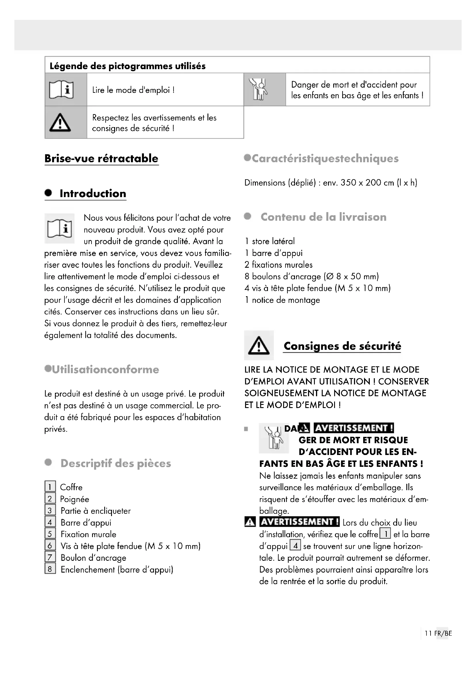 Enclenchement (barre d‘appui) Caractéristiques techniques Dimensions (déplié): env. 350 x 200 cm (l x h) Contenu de la livraison 1 store latéral 1 barre d‘appui 2 fixations murales 8 boulons d‘ancrage (Ø 8 x 50 mm) 4 vis à tête plate fendue (M 5 x 10 mm) 1 notice de montage Consignes de sécurité LIRE LA NOTICE DE MONTAGE ET LE MODE