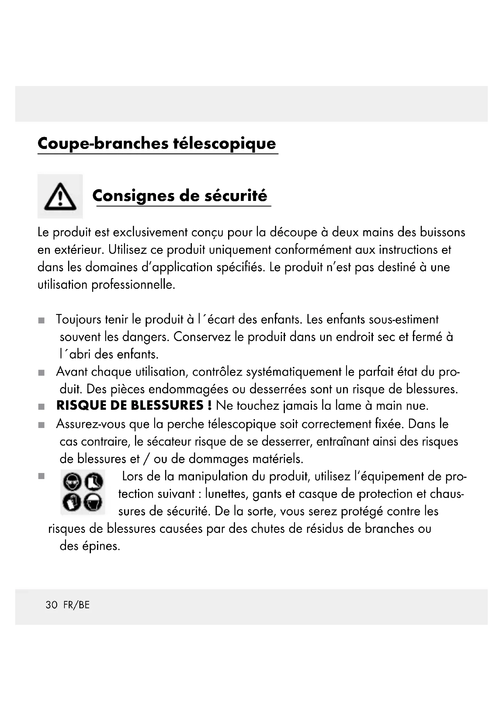 Bortskaffelse Emballagen består af miljøvenlige materialer, der kan bortskaffes på de lokale genbrugssteder. Muligheder for bortskaffelse af det udtjente produkt kan De få oplyst hos de lokale myndigheder.28 DK29 FR/BE Consignes de sécurité .............................................................Page 30 Montage de la lame à scie .................................................Page 31 Utilisation du sécateur ...........................................................Page 32 Réglage de l‘angle de coupe ...........................................Page 32 Rallonger la perche télescopique .................................Page 33 Couper et scier les branches .............................................Page 33 Conseils d´entretien .................................................................Page 33 Mise au rebut .................................................................................Page 3430 FR/BE Coupe-branches télescopique Consignes de sécurité Le produit est exclusivement conçu pour la découpe à deux mains des buissons en extérieur. Utilisez ce produit uniquement conformément aux instructions et dans les domaines d’application spécifiés. Le produit n’est pas destiné à une utilisation professionnelle. J Toujours tenir le produit à l´écart des enfants. Les enfants sous-estiment souvent les dangers. Conservez le produit dans un endroit sec et fermé à l´abri des enfants. J Avant chaque utilisation, contrôlez systématiquement le parfait état du pro- duit. Des pièces endommagées ou desserrées sont un risque de blessures. J RISQUE DE BLESSURES ! Ne touchez jamais la lame à main nue. J Assurez-vous que la perche télescopique soit correctement fixée. Dans le cas contraire, le sécateur risque de se desserrer, entraînant ainsi des risques de blessures et / ou de dommages matériels.