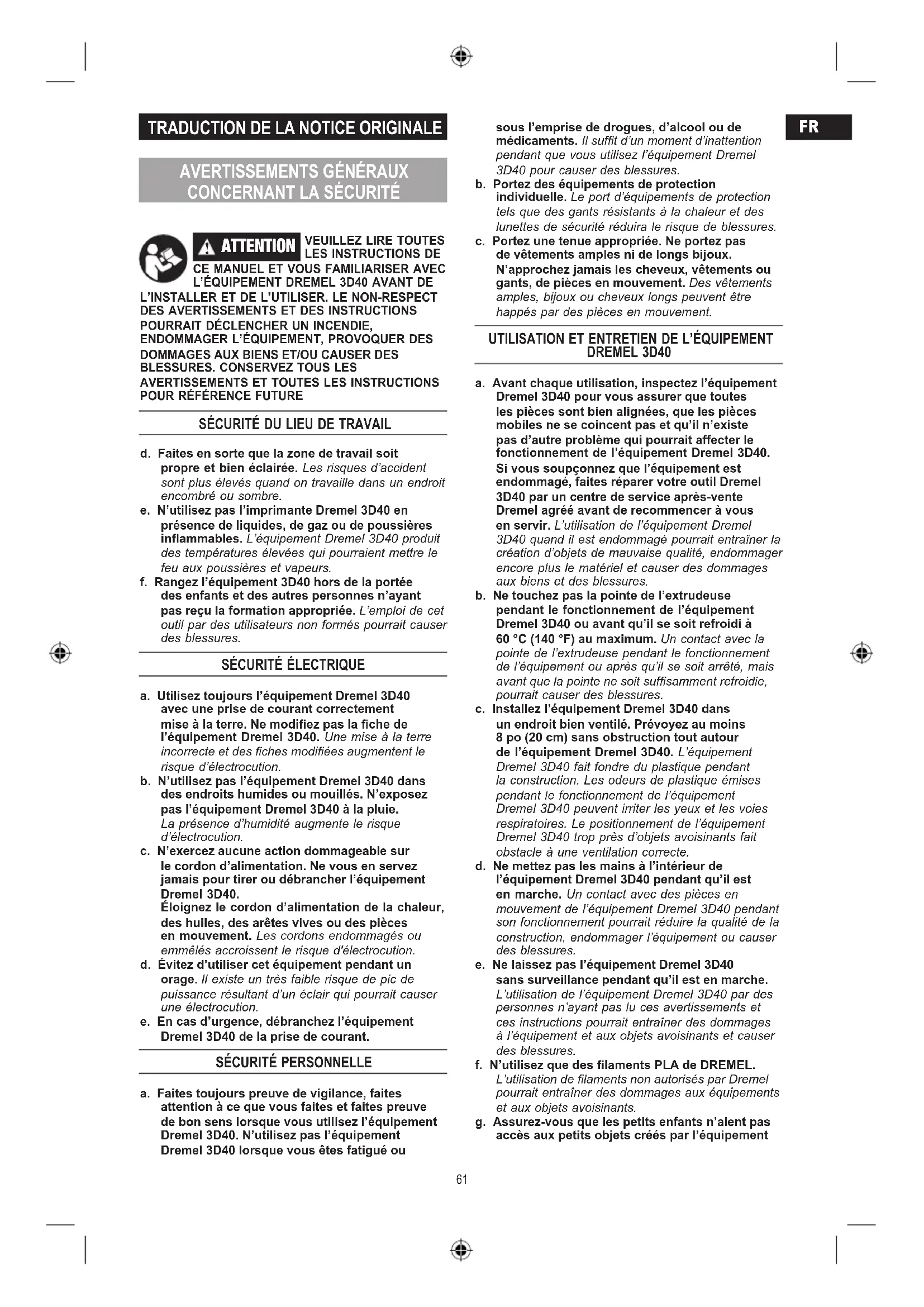DREMEL 3D40 a. Avant chaque utilisation, inspectez l’équipement Dremel 3D40 pour vous assurer que toutes les pièces sont bien alignées, que les pièces mobiles ne se coincent pas et qu’il n’existe pas d’autre problème qui pourrait affecter le fonctionnement de l’équipement Dremel 3D40. Si vous soupçonnez que l’équipement est endommagé, faites réparer votre outil Dremel 3D40 par un centre de service après-vente Dremel agréé avant de recommencer à vous en servir. L’utilisation de l’équipement Dremel 3D40 quand il est endommagé pourrait entraîner la création d’objets de mauvaise qualité, endommager encore plus le matériel et causer des dommages aux biens et des blessures. b. Ne touchez pas la pointe de l’extrudeuse pendant le fonctionnement de l’équipement Dremel 3D40 ou avant qu’il se soit refroidi à 60 °C (140 °F) au maximum. Un contact avec la pointe de l’extrudeuse pendant le fonctionnement de l’équipement ou après qu’il se soit arrêté, mais avant que la pointe ne soit sufsamment refroidie, pourrait causer des blessures. c. Installez l’équipement Dremel 3D40 dans un endroit bien ventilé. Prévoyez au moins 8 po (20 cm) sans obstruction tout autour de l’équipement Dremel 3D40. L’équipement Dremel 3D40 fait fondre du plastique pendant la construction. Les odeurs de plastique émises pendant le fonctionnement de l’équipement Dremel 3D40 peuvent irriter les yeux et les voies respiratoires. Le positionnement de l’équipement Dremel 3D40 trop près d’objets avoisinants fait obstacle à une ventilation correcte. d. Ne mettez pas les mains à l’intérieur de l’équipement Dremel 3D40 pendant qu’il est en marche. Un contact avec des pièces en mouvement de l’équipement Dremel 3D40 pendant son fonctionnement pourrait réduire la qualité de la construction, endommager l’équipement ou causer des blessures. e. Ne laissez pas l’équipement Dremel 3D40 sans surveillance pendant qu’il est en marche. L’utilisation de l’équipement Dremel 3D40 par des personnes n’ayant pas lu ces avertissements et ces instructions pourrait entraîner des dommages à l’équipement et aux objets avoisinants et causer des blessures. f. N’utilisez que des laments PLA de DREMEL. L’utilisation de laments non autorisés par Dremel pourrait entraîner des dommages aux équipements et aux objets avoisinants. g. Assurez-vous que les petits enfants n’aient pas accès aux petits objets créés par l’équipement