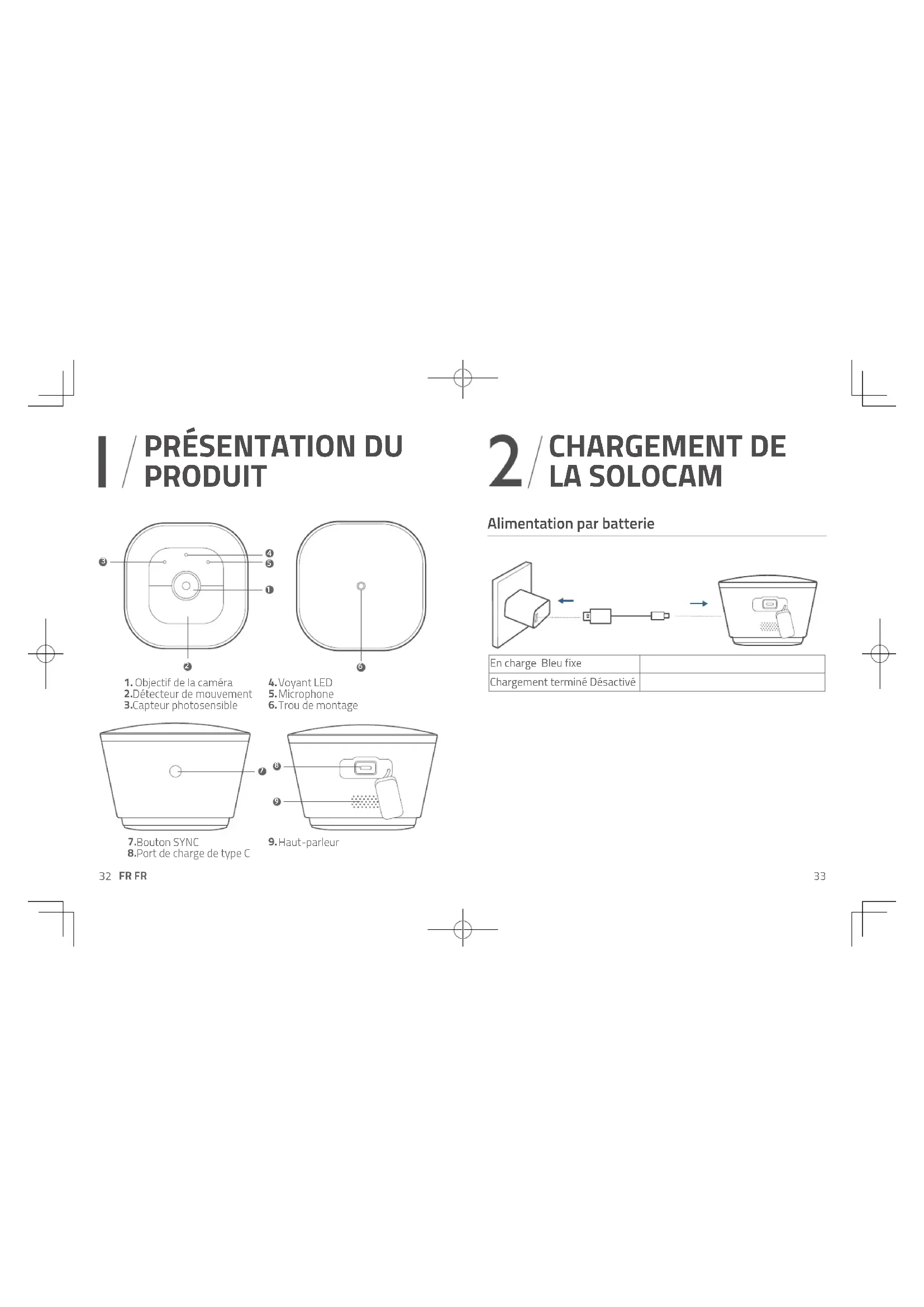 CHARGEMENT DE LA SOLOCAM Alimentation par batterie En charge Bleu fixe Chargement terminé Désactivé34 FR FR