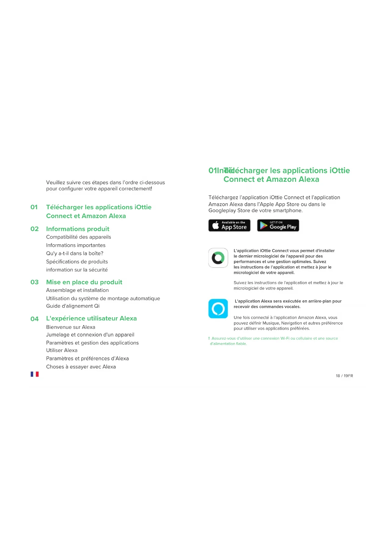 Call and Text Message Setting To enable Voice Messaging and Calling features, please enable Alexa access to your contacts for seamless communication. *Alexa App menu names subject to change at any time. Things to Try with Alexa With Alexa, users can ask for directions, play music, make hands-free calls, control smart home devices, and much more. Just ask! Navigation Alexa, navigate to Prospect Park. Alexa, take me to the nearest gas station. Alexa, get directions to home. Music Alexa, turn up the volume. Alexa, play rock music. Alexa, rewind 15 seconds. Communication Alexa, call Home. Alexa, text “Hello” to John. Alexa, call Hannah. Miscellaneous Alexa, find a nearby gas station. Alexa, what’s the weather? Alexa, tell me a story. Alexa, resume my audiobook. Alexa, lock the front door. Alexa, what’s on my to do list? Alexa, how does my day look? Alexa, what movies are playing? Alexa, what’s the news? 16 / 17ENTélécharger les applications iOttie Connect et Amazon Alexa 01Indice Téléchargez l’application iOttie Connect et l’application Amazon Alexa dans l’Apple App Store ou dans le Googleplay Store de votre smartphone. L'application Alexa sera exécutée en arrière-plan pour recevoir des commandes vocales. Une fois connecté à l’application Amazon Alexa, vous pouvez définir Musique, Navigation et autres préférence pour utiliser vos applications préférées. L'application iOttie Connect vous permet d'installer le dernier micrologiciel de l'appareil pour des performances et une gestion optimales. Suivez les instructions de l’application et mettez à jour le micrologiciel de votre appareil. Suivez les instructions de l'application et mettez à jour le micrologiciel de votre appareil. ! Assurez-vous d’utiliser une connexion Wi-Fi ou cellulaire et une source d’alimentation fiable. Veuillez suivre ces étapes dans l’ordre ci-dessous pour configurer votre appareil correctement! Télécharger les applications iOttie Connect et Amazon Alexa Informations produit Compatibilité des appareils Informations importantes Qu'y a-t-il dans la boîte? Spécifications de produits information sur la sécurité Mise en place du produit Assemblage et installation Utilisation du système de montage automatique Guide d'alignement Qi L'expérience utilisateur Alexa Bienvenue sur Alexa Jumelage et connexion d'un appareil Paramètres et gestion des applications Utiliser Alexa Paramètres et préférences d’Alexa Choses à essayer avec Alexa