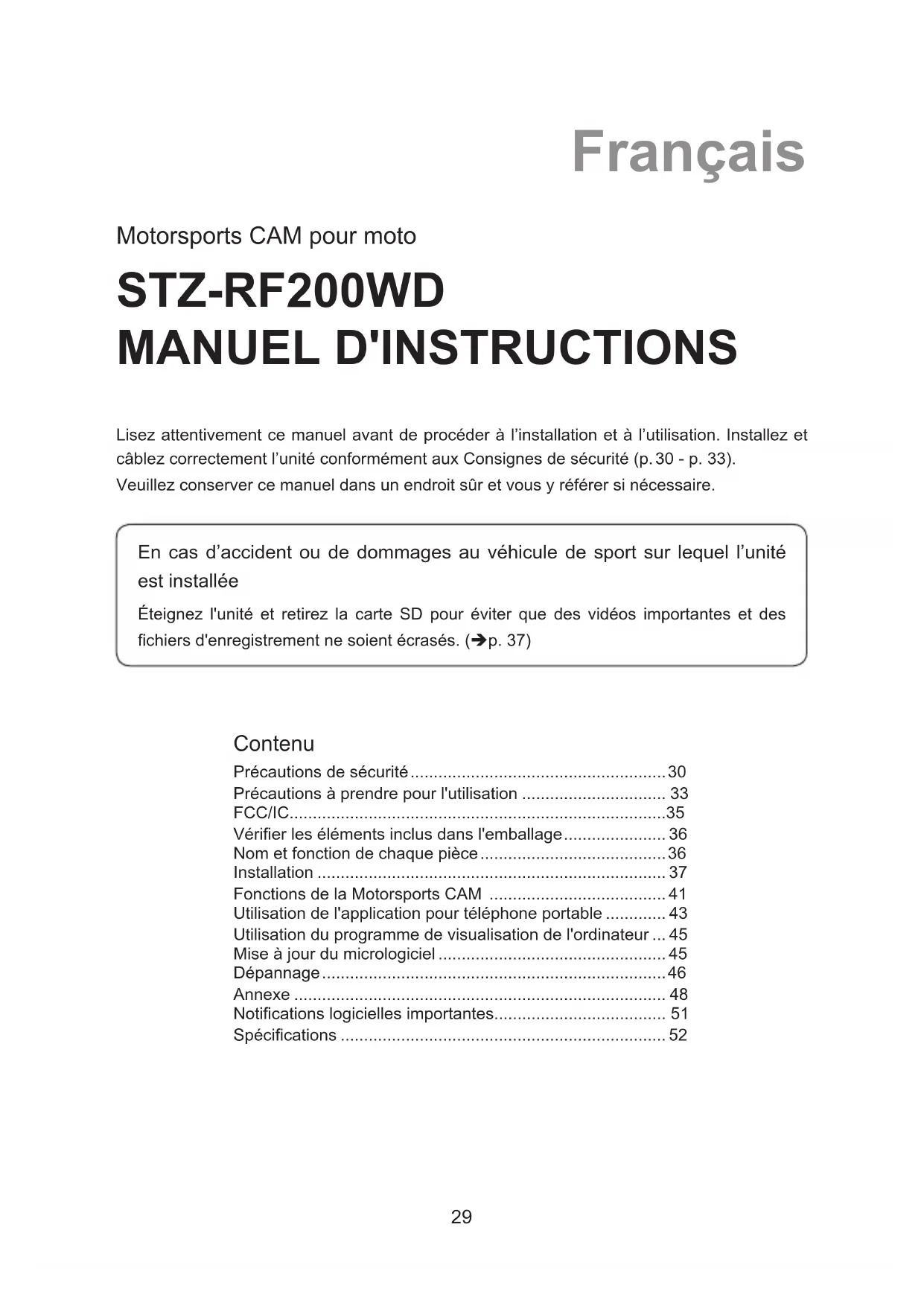 - Excluding cable.2728 JVCKENWOOD Corporation29 Motorsports CAM pour moto STZ-RF200WD MANUEL D'INSTRUCTIONS Lisez attentivement ce manuel avant de procéder à l’installation et à l’utilisation. Installez et câblez correctement l’unité conformément aux Consignes de sécurité (p. 30 - p. 33).Veuillez conserver ce manuel dans un endroit sûr et vous y référer si nécessaire. En cas d’accident ou de dommages au véhicule de sport sur lequel l’unité est installée Éteignez l'unité et retirez la carte SD pour éviter que des vidéos importantes et des chiers d'enregistrement ne soient écrasés. (p. 37) Français Contenu Précautions de sécurité ....................................................... 30Précautions à prendre pour l'utilisation ............................... 33FCC/IC ................................................................................. 35 Vérier les éléments inclus dans l'emballage ...................... 36 Nom et fonction de chaque pièce ........................................ 36 Installation ........................................................................... 37 Fonctions de la Motorsports CAM ...................................... 41 Utilisation de l'application pour téléphone portable ............. 43 Utilisation du programme de visualisation de l'ordinateur ... 45 Mise à jour du micrologiciel ................................................. 45 Dépannage .......................................................................... 46Annexe ................................................................................ 48Notications logicielles importantes..................................... 51 Spécications ...................................................................... 5230 Précautions de sécurité Ces symboles présentent des explications pour vous éviter de vous blesser et de blesser les autres, et pour prévenir tout dommage matériel. ■ Icônes de sécurité utilisées dans ce guide Avertissement Décrit des informations qui, si elles ne sont pas respectées, peuvent entraîner la mort ou des blessures graves. Mise en garde Décrit des informations pouvant entraîner des blessures corporelles ou des dommages matériels. Cette icône indique des mises en garde (et des avertissements) importantes. Cette icône indique les actions à éviter (actions interdites). Cette icône indique les actions à entreprendre (actions obligatoires et indiquées). Avertissement Installation et câblage