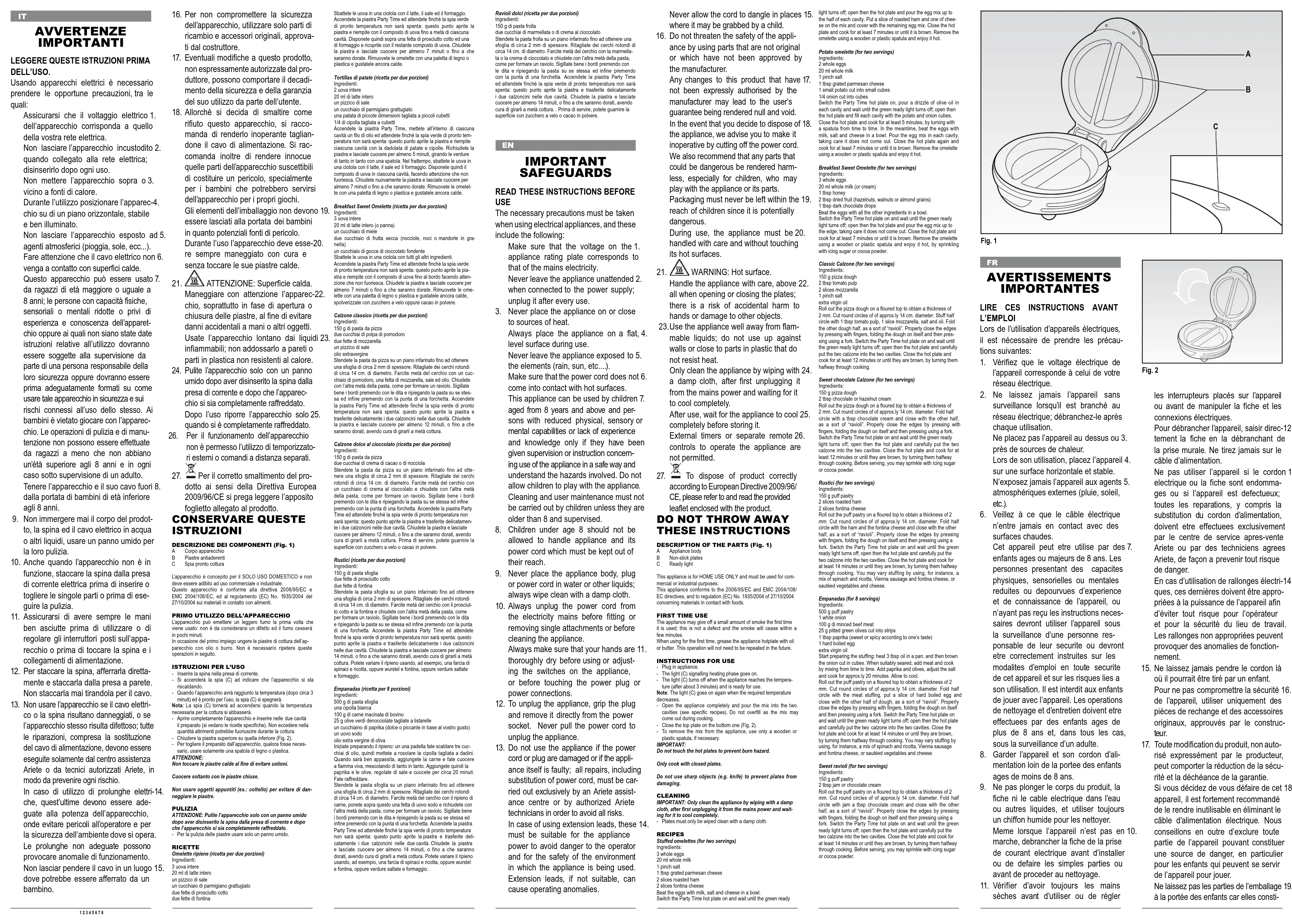 produit aux termes de la Directive Européenne 2009/96/CE, nous vous prions de lire le feuillet qui accompa- gne le produit. CONSERVEZ SOIGNEUSEMENT CES INSTRUCTIONS DESCRIPTION DES COMPOSANTS (Fig. 1)A Corps de l’appareilB Plaques anti-adhérentesC Témoin prêt pour la cuisson L’appareil est conçu UNIQUEMENT POUR UN USAGE DOMESTIQUE et il ne doit pas être destiné à un usage commer-cial ou industriel. Cet appareil est conforme à la directive 2006/95/EC et EMC 2004/108/EC, et à la réglementation (EC) N. 1935/2004 du 27/10/2004 concernant les matériaux en contact avec les ali- ments.PREMIERE UTILISATION DE L’APPAREIL L’appareil peut émettre une légère fumée la première fois qu’il est utilisé: cela ne doit pas être considéré comme un défaut et la fumée cessera après quelques minutes.Lors de la première utilisation de l’appareil, huiler les plaques de cuisson avec de l’huile ou du beurre. Il n’est pas nécessaire de répéter cette opération par la suite.MODE D’EMPLOI- Brancher la fiche dans la prise de courant.- Le témoin (C) s’allume pour indiquer que l’appareil est en phase de réchauffement.- Lorsque l’appareil atteint la température (au bout de 3 minutes environ) et est prêt pour la cuisson, le témoin (C) s’éteint.Note: Le témoin (C) s’allume de nouveau lorsque la température requise pour la cuisson diminue.- Ouvrez entièrement l’appareil et introduisez la préparation (voir les recettes spécifiques) dans les deux cavités. N’exagérez pas dans la quantité, autrement la préparation pourrait déborder durant la cuisson.- Fermez la plaque supérieure sur celle inférieure (Fig. 2).- Pour retirer la préparation de l’appareil, si cela est nécessaire, utilisez une spatule en bois ou en plastique.ATTENTION: Ne touchez pas les plaques chaudes pour éviter de vous brûler.Cuisez toujours avec les plaques fermées.N’utilisez pas d’objets pointus (ex. les couteaux) pour éviter d’endommager les plaques.NETTOYAGEATTENTION: Nettoyer l’appareil uniquement avec un chiffon humide après avoir débranché la fiche de la prise de courant et lorsque l’appareil est entièrement refroidi.- Pour le nettoyage des plaques, utiliser uniquement un chiffon humide.RECETTESOmelettes farcies (recette pour deux portions)Ingrédients:3 œufs entiers20 ml de lait entier Une pincée de selUne cuillère de parmesan râpé2 tranches de jambon cuit2 tranches de fromage fondantBattre les œufs dans une tasse avec le lait, le sel et le fromage. Allumer la plaque Party Time et attendre que le témoin vert de température s’éteigne: ouvrir alors la plaque et verser la prépara-tion d’œufs jusqu’à la moitié de chaque cavité. Disposer ensuite une tranche de jambon cuit et une tranche de fromage fondant et recouvrir avec le reste de préparation d’œufs. Fermer la plaque et faire cuire pendant au moins 7 minutes jusqu’à ce que les omelet-tes soient dorées. Retirer les omelettes à l’aide d’une spatule plate en bois ou en plastique et savourer-les chaudes. Tortillas de pommes de terre (recette pour deux portions)Ingrédients:2 œufs entiers20 ml de lait entier Une pincée de selUne cuillère de parmesan râpé1 pomme de terre de petites dimensions coupée en petits dés Fig. 1 Fig. 2
