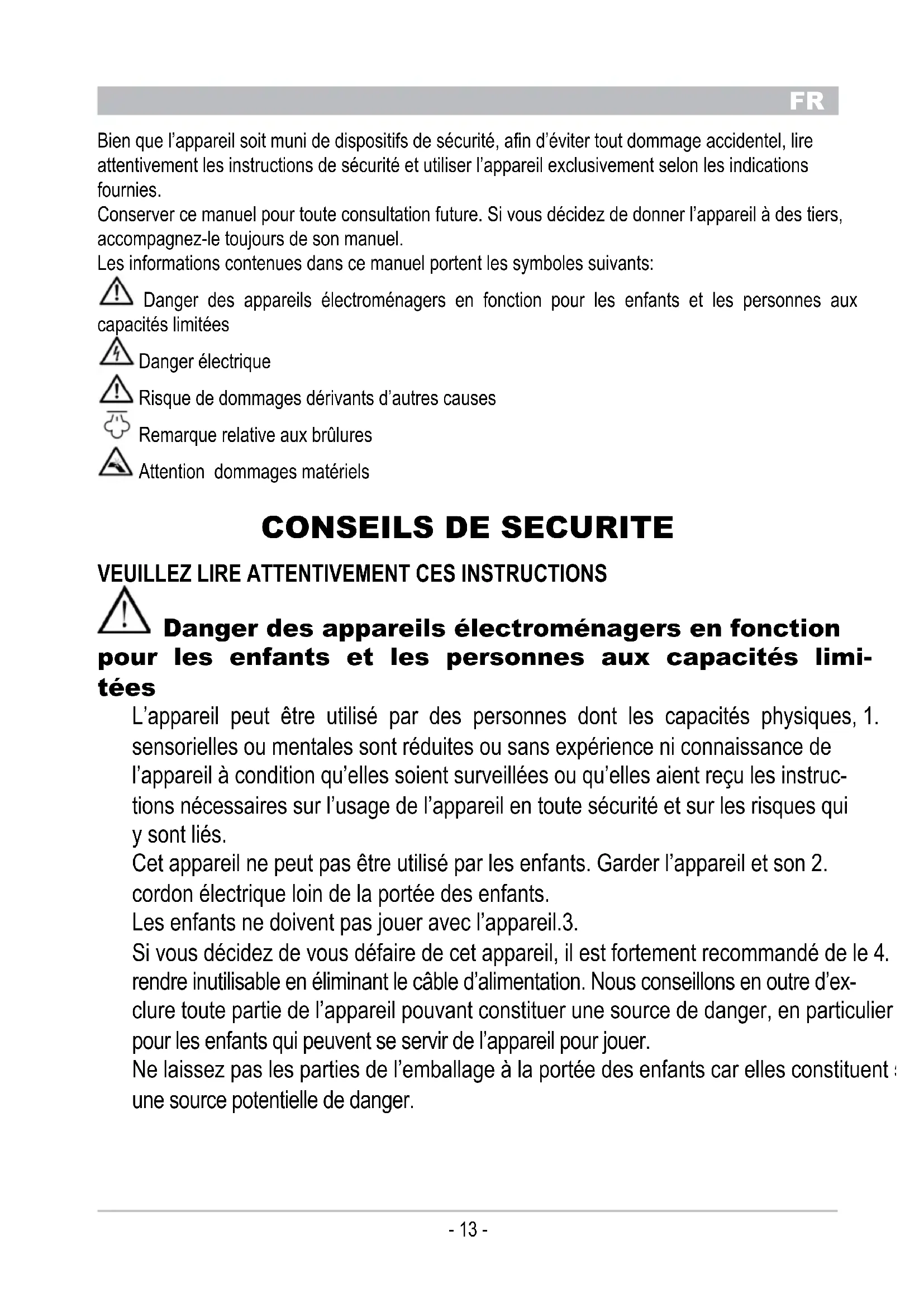 vEuIllEz lIRE AttENtIvEMENt CEs INstRuCtIONs Danger des appareils électroménagers en fonction pour les enfants et les personnes aux capacités limi- tées L’appareil peut être utilisé par des personnes dont les capacités physiques, 1. sensorielles ou mentales sont réduites ou sans expérience ni connaissance de l’appareil à condition qu’elles soient surveillées ou qu’elles aient reçu les instruc- tions nécessaires sur l’usage de l’appareil en toute sécurité et sur les risques qui y sont liés. Cet appareil ne peut pas être utilisé par les enfants. Garder l’appareil et son 2. cordon électrique loin de la portée des enfants. Les enfants ne doivent pas jouer avec l’appareil.3. Si vous décidez de vous défaire de cet appareil, il est fortement recommandé de le 4. rendre inutilisable en éliminant le câble d’alimentation. Nous conseillons en outre d’ex- clure toute partie de l’appareil pouvant constituer une source de danger, en particulier pour les enfants qui peuvent se servir de l’appareil pour jouer. Ne laissez pas les parties de l’emballage à la portée des enfants car elles constituent 5. une source potentielle de danger.FR
