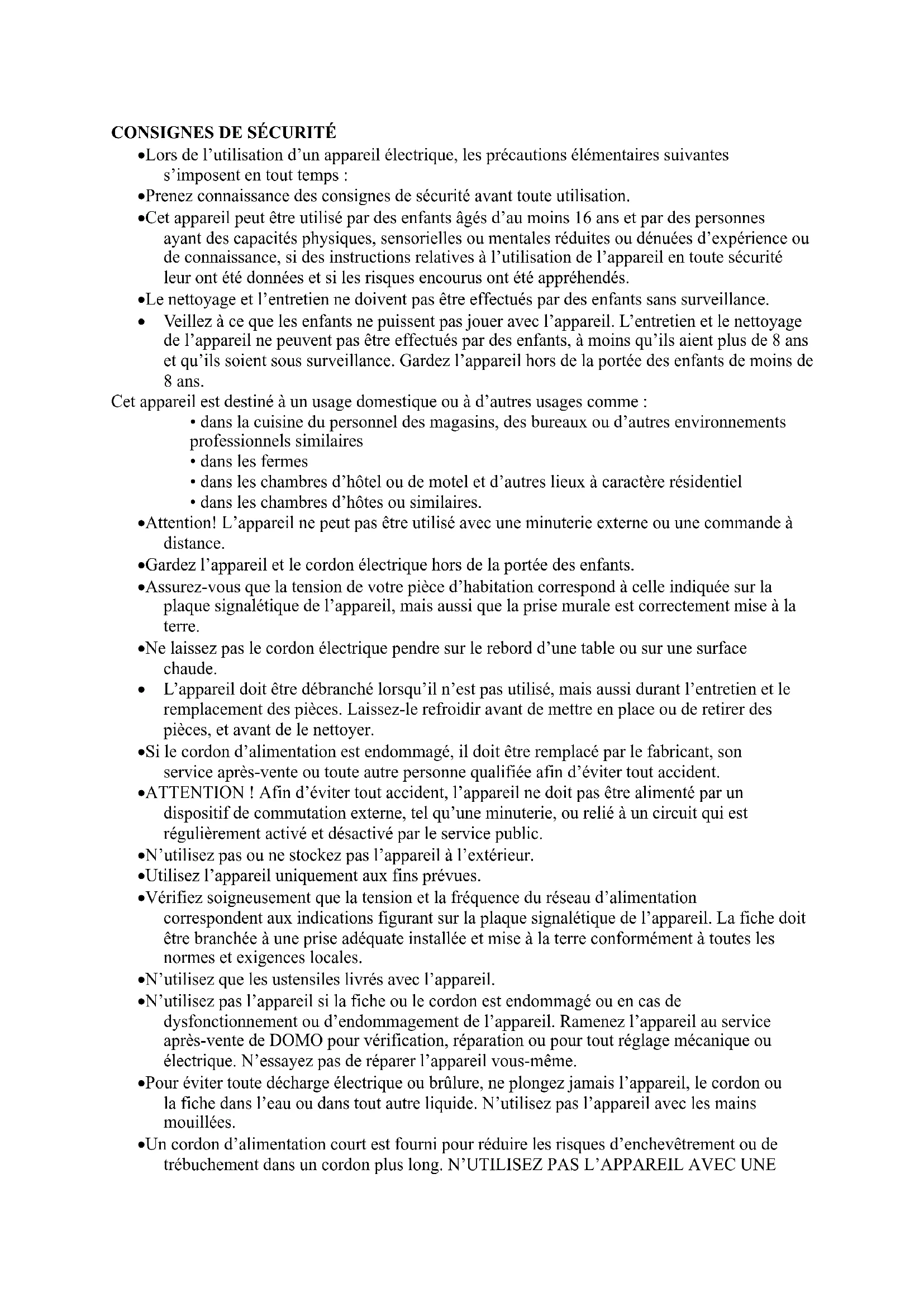 - dans les chambres d’hôtes ou similaires. Attention! L’appareil ne peut pas être utilisé avec une minuterie externe ou une commande à distance. Gardez l’appareil et le cordon électrique hors de la portée des enfants. Assurez-vous que la tension de votre pièce d’habitation correspond à celle indiquée sur la plaque signalétique de l’appareil, mais aussi que la prise murale est correctement mise à la terre. Ne laissez pas le cordon électrique pendre sur le rebord d’une table ou sur une surface chaude. L’appareil doit être débranché lorsqu’il n’est pas utilisé, mais aussi durant l’entretien et le remplacement des pièces. Laissez-le refroidir avant de mettre en place ou de retirer des pièces, et avant de le nettoyer. Si le cordon d’alimentation est endommagé, il doit être remplacé par le fabricant, son service après-vente ou toute autre personne qualifiée afin d’éviter tout accident. ATTENTION ! Afin d’éviter tout accident, l’appareil ne doit pas être alimenté par un dispositif de commutation externe, tel qu’une minuterie, ou relié à un circuit qui est régulièrement activé et désactivé par le service public. N’utilisez pas ou ne stockez pas l’appareil à l’extérieur. Utilisez l’appareil uniquement aux fins prévues. Vérifiez soigneusement que la tension et la fréquence du réseau d’alimentation correspondent aux indications figurant sur la plaque signalétique de l’appareil. La fiche doit être branchée à une prise adéquate installée et mise à la terre conformément à toutes les normes et exigences locales. N’utilisez que les ustensiles livrés avec l’appareil. N’utilisez pas l’appareil si la fiche ou le cordon est endommagé ou en cas de dysfonctionnement ou d’endommagement de l’appareil. Ramenez l’appareil au service après-vente de DOMO pour vérification, réparation ou pour tout réglage mécanique ou électrique. N’essayez pas de réparer l’appareil vous-même. Pour éviter toute décharge électrique ou brûlure, ne plongez jamais l’appareil, le cordon ou la fiche dans l’eau ou dans tout autre liquide. N’utilisez pas l’appareil avec les mains mouillées. Un cordon d’alimentation court est fourni pour réduire les risques d’enchevêtrement ou de trébuchement dans un cordon plus long. N’UTILISEZ PAS L’APPAREIL AVEC UNERALLONGE. Déroulez complètement le cordon pour éviter qu’il ne surchauffe. Ne laissez pas le cordon d’alimentation pendre sur le rebord d’un comptoir ou entrer en contact avec une surface chaude. Ne laissez pas le cordon d’alimentation glisser sous ou autour de l’appareil. N’utilisez pas l’appareil sans ingrédients. Ne pas maintenir cet appareil propre pourrait influencer négativement sa durée de vie et provoquer une situation dangereuse. Toute lésion ou tout préjudice occasionné par le non-respect de ces règles est à vos propres risques. Ni le fabricant, ni l’importateur, ni le fournisseur ne peuvent être tenus responsables. Ne placez jamais cet appareil sur ou à proximité d’un feu au gaz ou d’un feu électrique ou à tout autre endroit où il pourrait entrer en contact avec un appareil chaud. Utilisez toujours l’appareil sur une surface solide, sèche et plane. CONSERVEZ CES INSTRUCTIONS POUR RÉFÉRENCE FUTURE