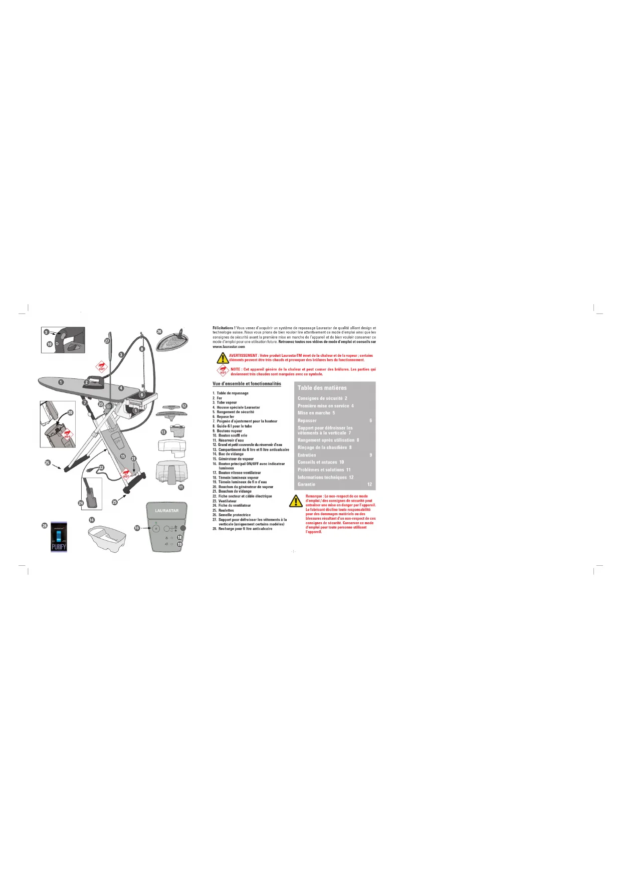 FR- 11 - Problèmes et solutions Symptômes Causes possibles Solutions TEMOIN LIMUNEUX Si un «bip» sonore retentit et la lampe témoin est rouge.• Y a-t-il de l’eau dans le réservoir d’eau froide?• Le réservoir d’eau froide est-il bien en place?Voir page 4La lampe témoin verte s’allume et s’éteint pendant le fonctionnement.Normal! Voir page 5 GENERAL La pointe de la table à repasser est mouillée en position verticale.Possible après utilisation. Véri er la présence éventuelle de condensation sous la housse de repassage avant son rangement et la laisser sécher.Voir page 5Craquements lors de la mise en service. Normal! Voir page 5 FER La semelle goutte.• La chaudière a-t-elle été rincée?• Condensation après une longue pause de repassage?• La lampe témoin orange du fer est-elle éteinte et la verte allumée?• Vous venez de xer la semelle SOFTPRESSING?• Vous utilisez l’eau recommandée?Voir page 8Voir page 5Voir page 5Voir page 5Voir page 4 VAPEUR Pas de vapeur.• Y a-t-il de l’eau dans le réservoir d’eau froide?• Le système est-il en service?Voir page 4Voir page 5 Si le problème ne peut pas être résolu, s’adresser au service-clients LAURASTAR. Renvoi au Service Clients 1 Eteindre l’appareil et débrancher la che secteur. 2 Relever le numéro de série de l’appareil (au dos de la chaudière). 3 Avoir sous les yeux la quittance d’achat et le livret de garantie. 4 Appeler le service-clients LAURASTAR et suivre les instructions.- 12 - Informations techniques Caractéristiques techniques Garantie internationale de Laurastar