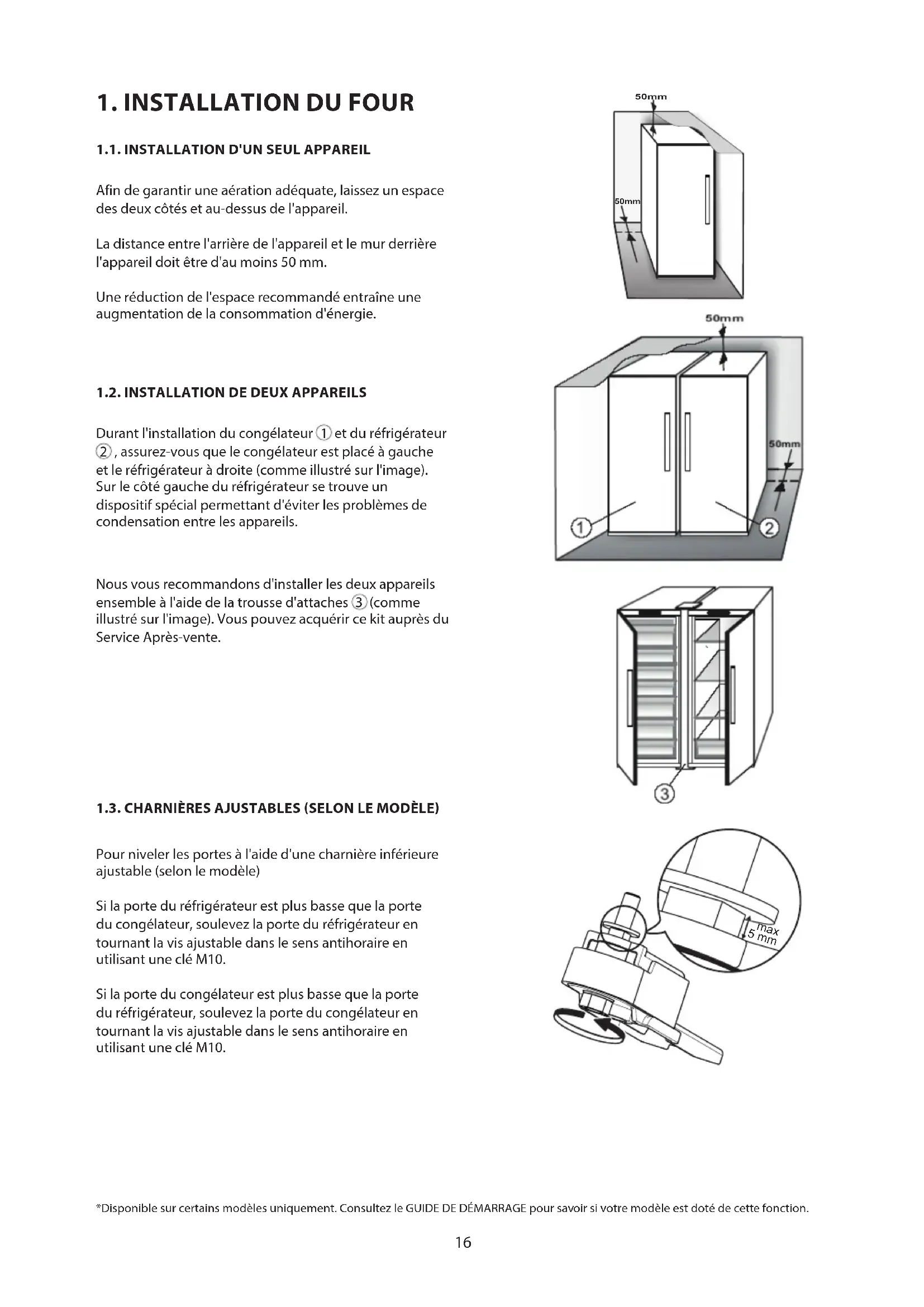 (comme illustré sur l'image). Vous pouvez acquérir ce kit auprès du Service Après-vente. 1.3. CHARNIÈRES AJUSTABLES (SELON LE MODÈLE) Pour niveler les portes à l'aide d'une charnière inférieure ajustable (selon le modèle) Si la porte du réfrigérateur est plus basse que la porte du congélateur, soulevez la porte du réfrigérateur en tournant la vis ajustable dans le sens antihoraire en utilisant une clé M10. Si la porte du congélateur est plus basse que la porte du réfrigérateur, soulevez la porte du congélateur en tournant la vis ajustable dans le sens antihoraire en utilisant une clé M10. *Disponible sur certains modèles uniquement. Consultez le GUIDE DE DÉMARRAGE pour savoir si votre modèle est doté de cette fonction. 50mm 50mm 5 mm max17