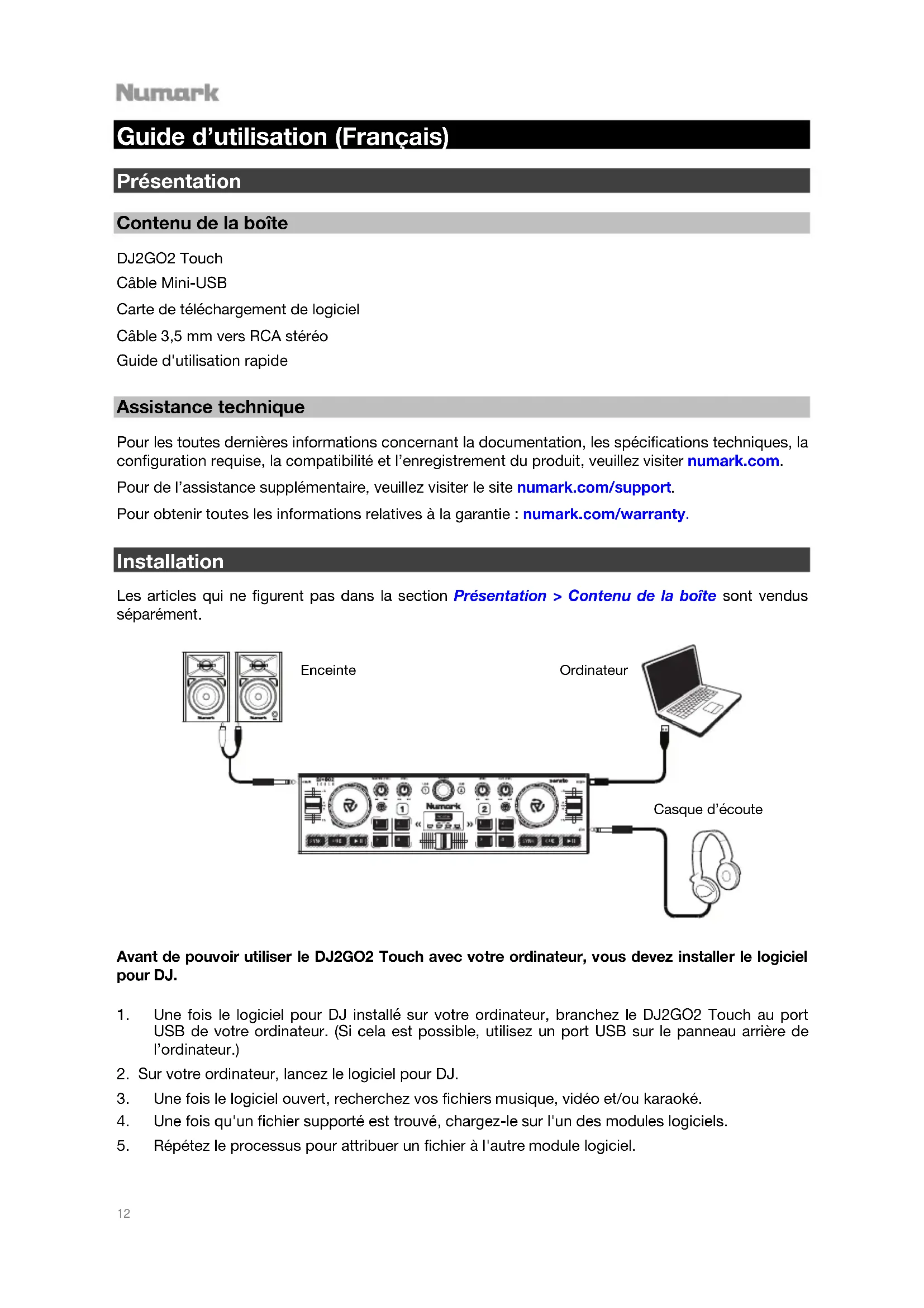 Guide d’utilisation (Français) Présentation Contenu de la boîte DJ2GO2 Touch Câble Mini-USB Carte de téléchargement de logiciel Câble 3,5 mm vers RCA stéréo Guide d'utilisation rapide Assistance technique Pour les toutes dernières informations concernant la documentation, les spécifications techniques, la configuration requise, la compatibilité et l’enregistrement du produit, veuillez visiter numark.com. Pour de l’assistance supplémentaire, veuillez visiter le site numark.com/support. Pour obtenir toutes les informations relatives à la garantie : numark.com/warranty. Installation Les articles qui ne figurent pas dans la section Présentation > Contenu de la boîte sont vendus séparément.