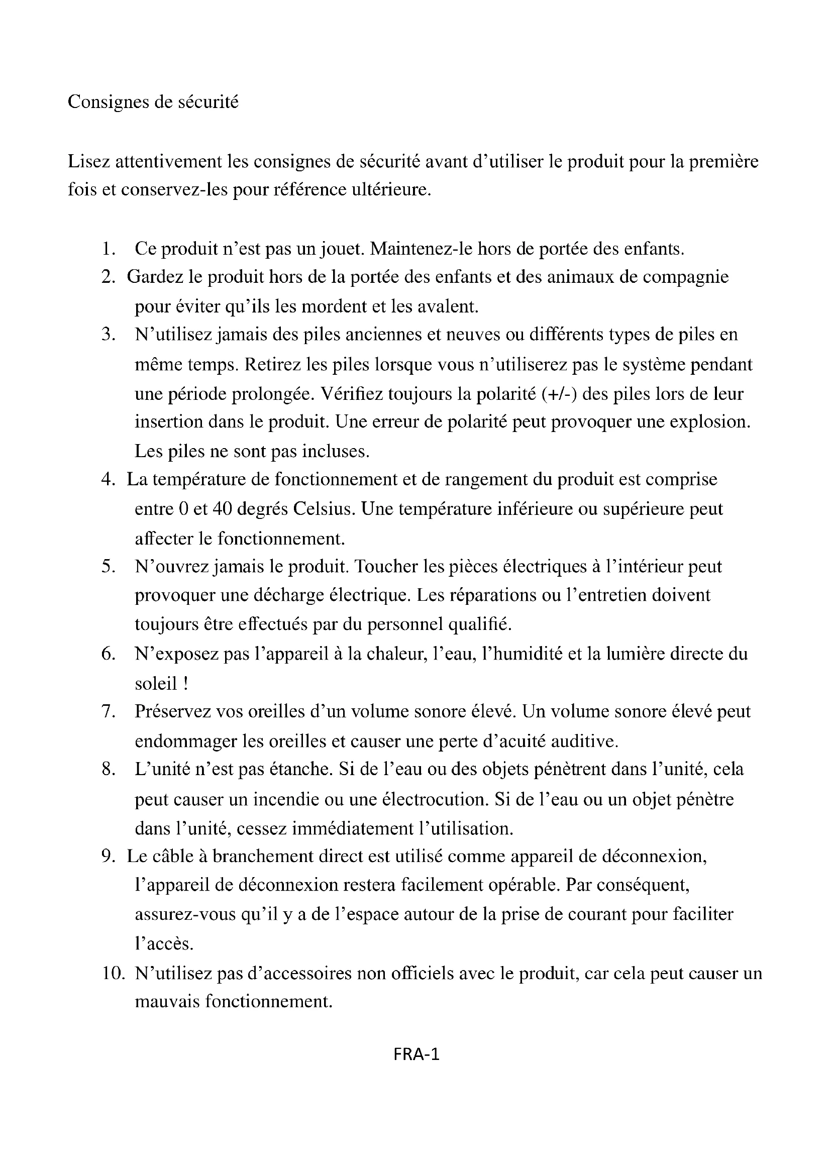 mauvais fonctionnement. FRA-1Alimentation secteur Branchez le cordon secteur détachable dans une prise secteur standard (100-240 V~ 50/60 Hz) Puissance de la batterie Nécessite 4 piles de type C, non fournies.