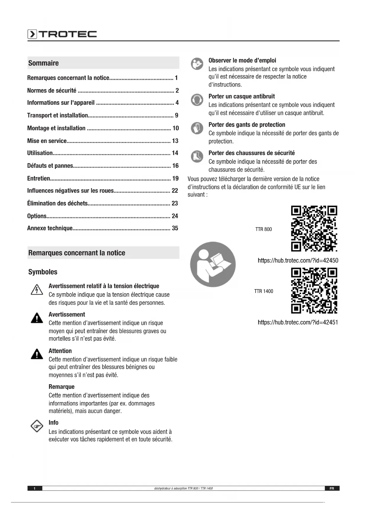 - Annexe technique Remarques concernant la notice Symboles Avertissement relatif à la tension électrique Ce symbole indique que la tension électrique cause des risques pour la vie et la santé des personnes. Avertissement Cette mention d’avertissement indique un risque moyen qui peut entraîner des blessures graves ou mortelles s’il n’est pas évité. Attention Cette mention d’avertissement indique un risque faible qui peut entraîner des blessures bénignes ou moyennes s’il n’est pas évité. Remarque Cette mention d’avertissement indique des informations importantes (par ex. dommages matériels), mais aucun danger. Info Les indications présentant ce symbole vous aident à exécuter vos tâches rapidement et en toute sécurité. Observer le mode d’emploi Les indications présentant ce symbole vous indiquent qu’il est nécessaire de respecter la notice d'instructions. Porter un casque antibruit Les indications présentant ce symbole vous indiquent qu’il est nécessaire d'utiliser un casque antibruit. Porter des gants de protection Ce symbole indique la nécessité de porter des gants de protection. Porter des chaussures de sécurité Ce symbole indique la nécessité de porter des chaussures de sécurité. Vous pouvez télécharger la dernière version de la notice d’instructions et la déclaration de conformité UE sur le lien suivant: TTR 800 https://hub.trotec.com/?id=42450 TTR 1400 https://hub.trotec.com/?id=42451FR 2 déshydrateur à adsorption TTR 800 / TTR 1400 Normes de sécurité Veuillez lire attentivement le présent manuel avant la mise en service ou l'utilisation de l'appareil et conservez-le à proximité immédiate de l'endroit d'installation ou de l'appareil même! Avertissement Lisez toutes les consignes de sécurité et toutes les instructions. Le non-respect des consignes de sécurité et des instructions risque de provoquer une électrocution, un incendie et/ou de graves blessures. Conservez toutes les consignes de sécurité et toutes les instructions pour pouvoir vous y reporter ultérieurement. p. 35