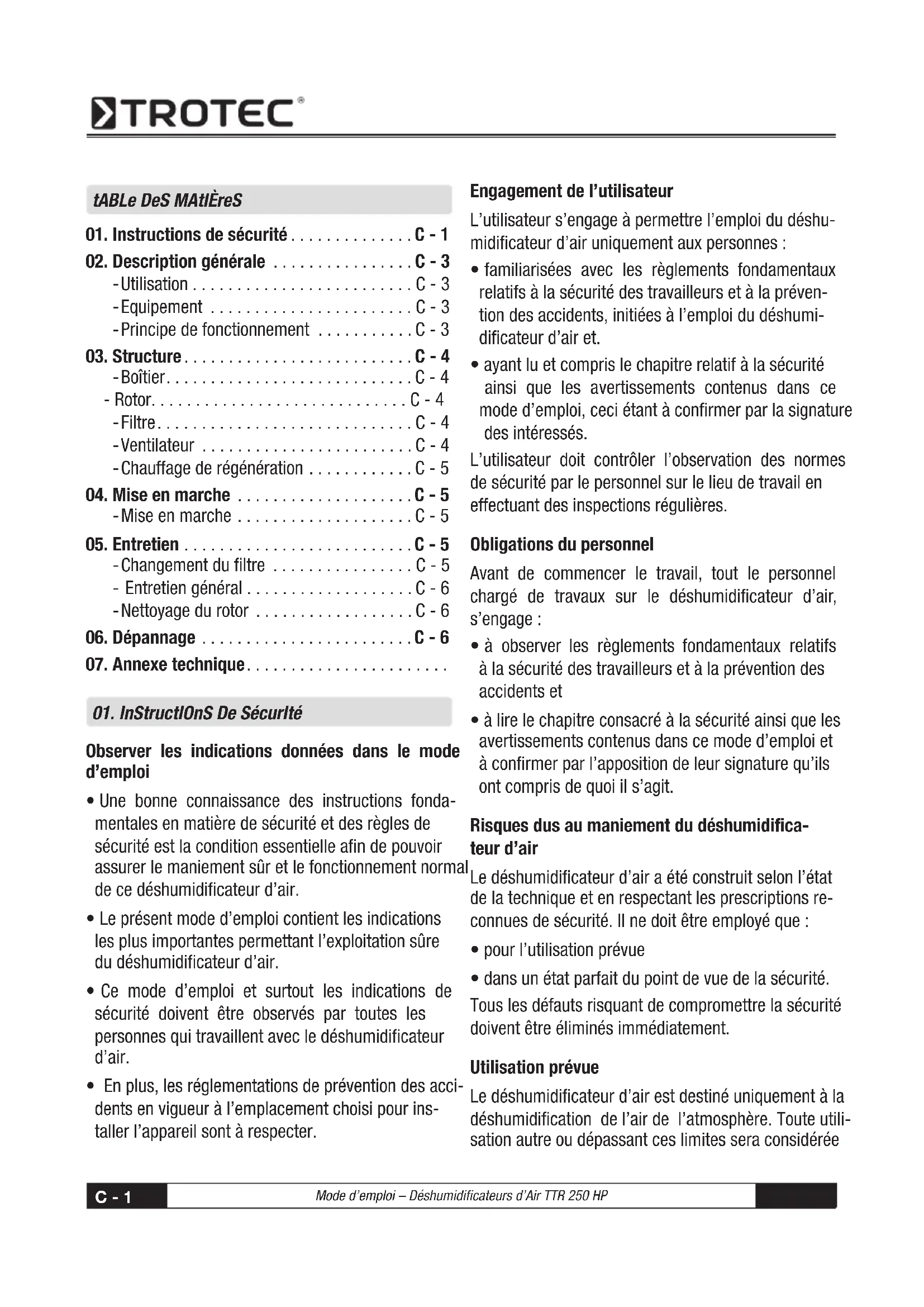 - dans un état parfait du point de vue de la sécurité. Tous les défauts risquant de compromettre la sécurité doivent être éliminés immédiatement. Utilisation prévue Le déshumidificateur d’air est destiné uniquement à la déshumidification de l’air de l’atmosphère. Toute utili- sation autre ou dépassant ces limites sera considéréeFR Mode d’emploi – Déshumidificateurs d’air TTR 250 HP C - 2 comme un non-respect de l’usage prévu. La compagnie Trotec GmbH n’assumera aucune responsabilité pour les dommages occasionnés par des non-respect de l’usage prévu. L’utilisation prévue suppose également :