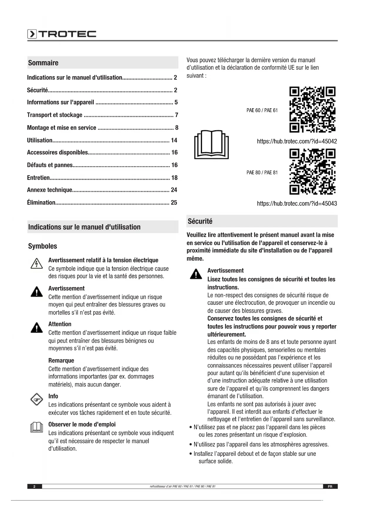 - Élimination Indications sur le manuel d'utilisation Symboles Avertissement relatif à la tension électrique Ce symbole indique que la tension électrique cause des risques pour la vie et la santé des personnes. Avertissement Cette mention d’avertissement indique un risque moyen qui peut entraîner des blessures graves ou mortelles s’il n’est pas évité. Attention Cette mention d’avertissement indique un risque faible qui peut entraîner des blessures bénignes ou moyennes s’il n’est pas évité. Remarque Cette mention d’avertissement indique des informations importantes (par ex. dommages matériels), mais aucun danger. Info Les indications présentant ce symbole vous aident à exécuter vos tâches rapidement et en toute sécurité. Observer le mode d’emploi Les indications présentant ce symbole vous indiquent qu’il est nécessaire de respecter le manuel d'utilisation. Vous pouvez télécharger la dernière version du manuel d’utilisation et la déclaration de conformité UE sur le lien suivant: PAE 60 / PAE 61 https://hub.trotec.com/?id=45042 PAE 80 / PAE 81 https://hub.trotec.com/?id=45043 Sécurité Veuillez lire attentivement le présent manuel avant la mise en service ou l'utilisation de l'appareil et conservez-le à proximité immédiate du site d'installation ou de l'appareil même. Avertissement Lisez toutes les consignes de sécurité et toutes les instructions. Le non-respect des consignes de sécurité risque de causer une électrocution, de provoquer un incendie ou de causer des blessures graves. Conservez toutes les consignes de sécurité et toutes les instructions pour pouvoir vous y reporter ultérieurement. Les enfants de moins de 8 ans et toute personne ayant des capacités physiques, sensorielles ou mentales réduites ou ne possédant pas l'expérience et les connaissances nécessaires peuvent utiliser l'appareil pour autant qu'ils bénéficient d'une supervision et d’une instruction adéquate relative à une utilisation sure de l'appareil et qu'ils comprennent les dangers émanant de l’utilisation. Les enfants ne sont pas autorisés à jouer avec l'appareil. Il est interdit aux enfants d'effectuer le nettoyage et l'entretien de l’appareil sans surveillance. p. 25