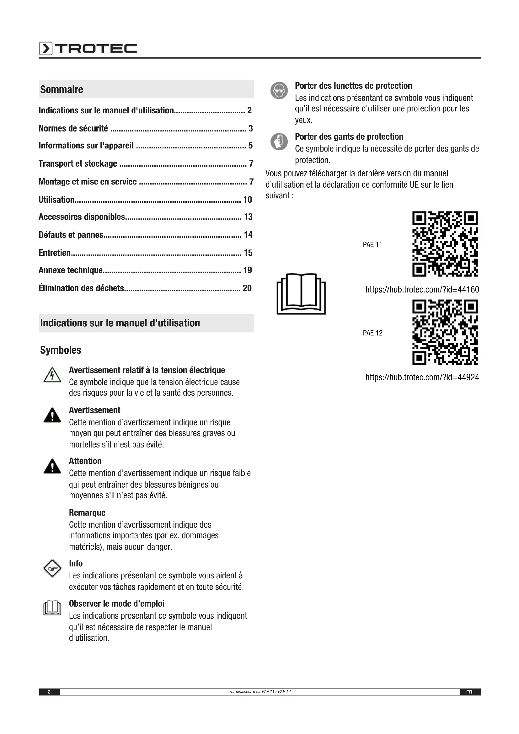 - Élimination des déchets Indications sur le manuel d'utilisation Symboles Avertissement relatif à la tension électrique Ce symbole indique que la tension électrique cause des risques pour la vie et la santé des personnes. Avertissement Cette mention d’avertissement indique un risque moyen qui peut entraîner des blessures graves ou mortelles s’il n’est pas évité. Attention Cette mention d’avertissement indique un risque faible qui peut entraîner des blessures bénignes ou moyennes s’il n’est pas évité. Remarque Cette mention d’avertissement indique des informations importantes (par ex. dommages matériels), mais aucun danger. Info Les indications présentant ce symbole vous aident à exécuter vos tâches rapidement et en toute sécurité. Observer le mode d’emploi Les indications présentant ce symbole vous indiquent qu’il est nécessaire de respecter le manuel d'utilisation. Porter des lunettes de protection Les indications présentant ce symbole vous indiquent qu’il est nécessaire d'utiliser une protection pour les yeux. Porter des gants de protection Ce symbole indique la nécessité de porter des gants de protection. Vous pouvez télécharger la dernière version du manuel d’utilisation et la déclaration de conformité UE sur le lien suivant: PAE 11 https://hub.trotec.com/?id=44160 PAE 12 https://hub.trotec.com/?id=44924FR 3 refroidisseur d'air PAE 11 / PAE 12 Normes de sécurité Veuillez lire attentivement le présent manuel avant la mise en service ou l'utilisation de l'appareil et conservez-le à proximité immédiate du site d'installation ou de l'appareil même. Avertissement Lisez toutes les consignes de sécurité et toutes les instructions. Le non-respect des consignes de sécurité risque de causer une électrocution, de provoquer un incendie ou de causer des blessures graves. Conservez toutes les consignes de sécurité et toutes les instructions pour pouvoir vous y reporter ultérieurement. Les enfants de moins de 8 ans et toute personne ayant des capacités physiques, sensorielles ou mentales réduites ou ne possédant pas l'expérience et les connaissances nécessaires peuvent utiliser l'appareil pour autant qu'ils bénéficient d'une supervision et d’une instruction adéquate relative à une utilisation sure de l'appareil et qu'ils comprennent les dangers émanant de l’utilisation. Les enfants ne sont pas autorisés à jouer avec l'appareil. Il est interdit aux enfants d'effectuer le nettoyage et l'entretien de l’appareil sans surveillance. p. 20