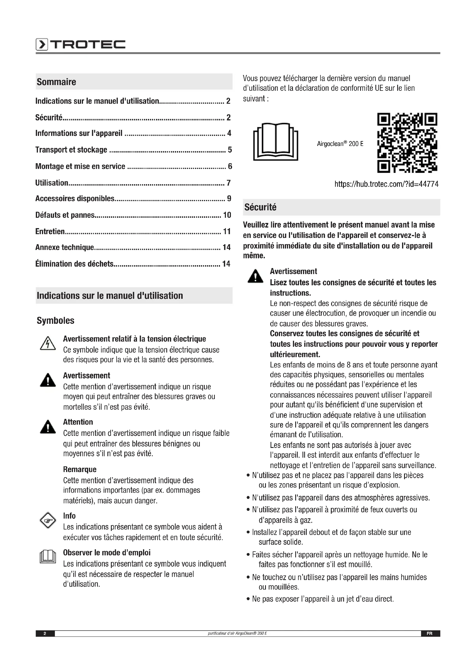 200 E https://hub.trotec.com/?id=44774 Sécurité Veuillez lire attentivement le présent manuel avant la mise en service ou l'utilisation de l'appareil et conservez-le à proximité immédiate du site d'installation ou de l'appareil même. Avertissement Lisez toutes les consignes de sécurité et toutes les instructions. Le non-respect des consignes de sécurité risque de causer une électrocution, de provoquer un incendie ou de causer des blessures graves. Conservez toutes les consignes de sécurité et toutes les instructions pour pouvoir vous y reporter ultérieurement. Les enfants de moins de 8 ans et toute personne ayant des capacités physiques, sensorielles ou mentales réduites ou ne possédant pas l'expérience et les connaissances nécessaires peuvent utiliser l'appareil pour autant qu'ils bénéficient d'une supervision et d’une instruction adéquate relative à une utilisation sure de l'appareil et qu'ils comprennent les dangers émanant de l’utilisation. Les enfants ne sont pas autorisés à jouer avec l'appareil. Il est interdit aux enfants d'effectuer le nettoyage et l'entretien de l’appareil sans surveillance.
