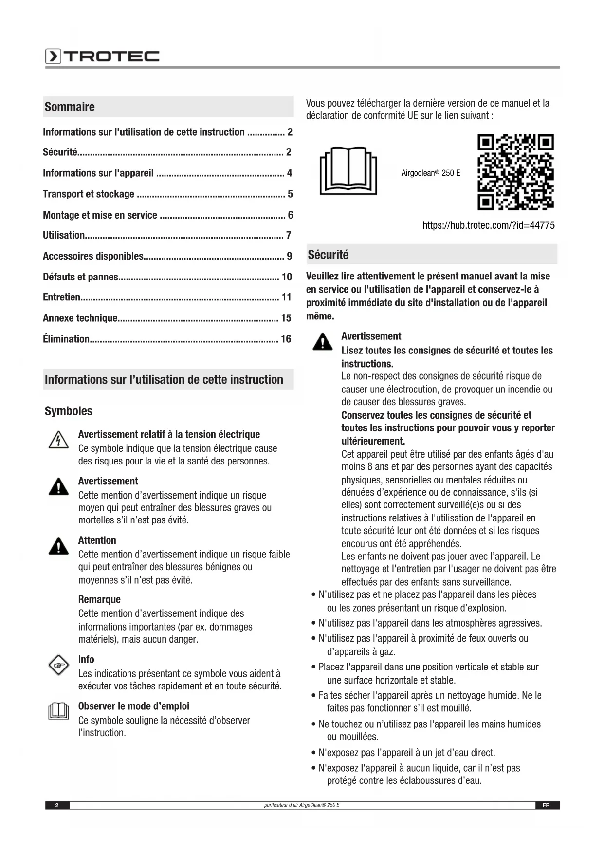 250 E https://hub.trotec.com/?id=44775 Sécurité Veuillez lire attentivement le présent manuel avant la mise en service ou l'utilisation de l'appareil et conservez-le à proximité immédiate du site d'installation ou de l'appareil même. Avertissement Lisez toutes les consignes de sécurité et toutes les instructions. Le non-respect des consignes de sécurité risque de causer une électrocution, de provoquer un incendie ou de causer des blessures graves. Conservez toutes les consignes de sécurité et toutes les instructions pour pouvoir vous y reporter ultérieurement. Cet appareil peut être utilisé par des enfants âgés d'au moins 8 ans et par des personnes ayant des capacités physiques, sensorielles ou mentales réduites ou dénuées d’expérience ou de connaissance, s'ils (si elles) sont correctement surveillé(e)s ou si des instructions relatives à l'utilisation de l'appareil en toute sécurité leur ont été données et si les risques encourus ont été appréhendés. Les enfants ne doivent pas jouer avec l’appareil. Le nettoyage et l'entretien par l'usager ne doivent pas être effectués par des enfants sans surveillance.