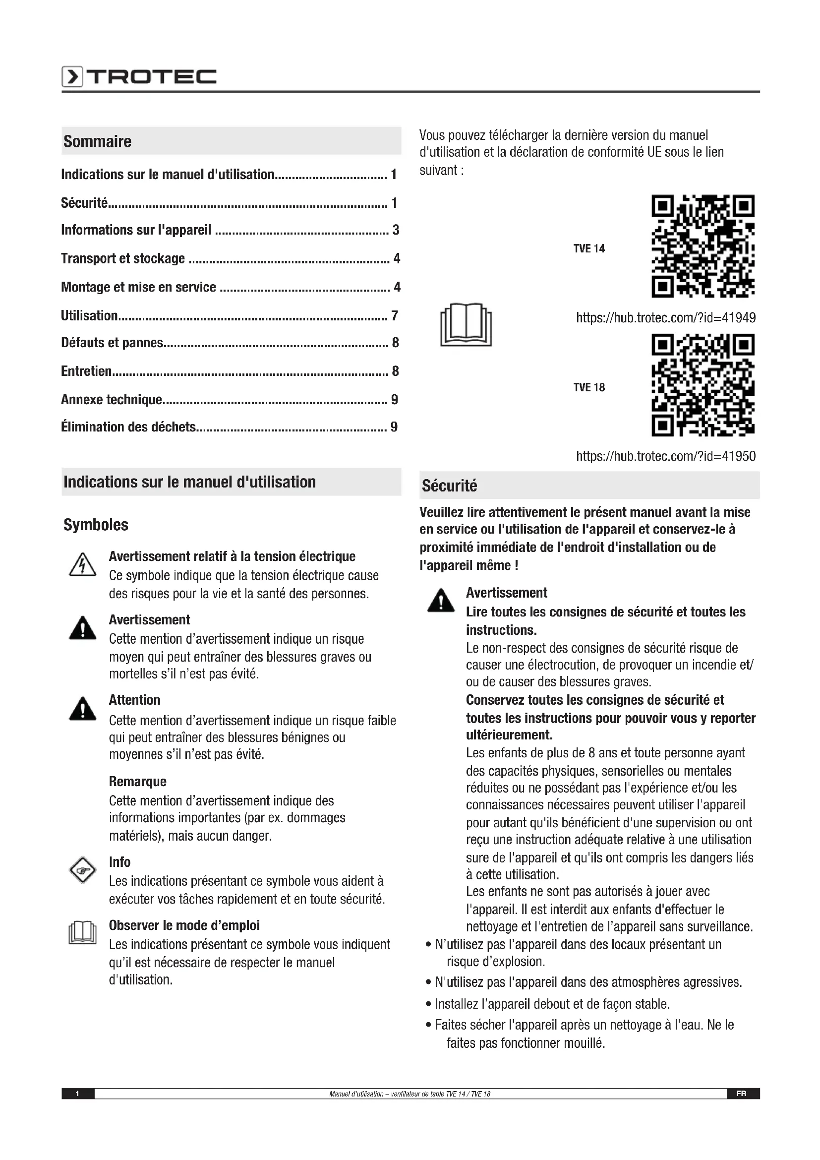 - Élimination des déchets Indications sur le manuel d'utilisation Symboles Avertissement relatif à la tension électrique Ce symbole indique que la tension électrique cause des risques pour la vie et la santé des personnes. Avertissement Cette mention d’avertissement indique un risque moyen qui peut entraîner des blessures graves ou mortelles s’il n’est pas évité. Attention Cette mention d’avertissement indique un risque faible qui peut entraîner des blessures bénignes ou moyennes s’il n’est pas évité. Remarque Cette mention d’avertissement indique des informations importantes (par ex. dommages matériels), mais aucun danger. Info Les indications présentant ce symbole vous aident à exécuter vos tâches rapidement et en toute sécurité. Observer le mode d’emploi Les indications présentant ce symbole vous indiquent qu’il est nécessaire de respecter le manuel d'utilisation. Vous pouvez télécharger la dernière version du manuel d'utilisation et la déclaration de conformité UE sous le lien suivant: TVE 14 https://hub.trotec.com/?id=41949 TVE 18 https://hub.trotec.com/?id=41950 Sécurité Veuillez lire attentivement le présent manuel avant la mise en service ou l'utilisation de l'appareil et conservez-le à proximité immédiate de l'endroit d'installation ou de l'appareil même! Avertissement Lire toutes les consignes de sécurité et toutes les instructions. Le non-respect des consignes de sécurité risque de causer une électrocution, de provoquer un incendie et/ ou de causer des blessures graves. Conservez toutes les consignes de sécurité et toutes les instructions pour pouvoir vous y reporter ultérieurement. Les enfants de plus de 8 ans et toute personne ayant des capacités physiques, sensorielles ou mentales réduites ou ne possédant pas l'expérience et/ou les connaissances nécessaires peuvent utiliser l'appareil pour autant qu'ils bénéficient d'une supervision ou ont reçu une instruction adéquate relative à une utilisation sure de l'appareil et qu'ils ont compris les dangers liés à cette utilisation. Les enfants ne sont pas autorisés à jouer avec l'appareil. Il est interdit aux enfants d'effectuer le nettoyage et l'entretien de l’appareil sans surveillance. p. 9