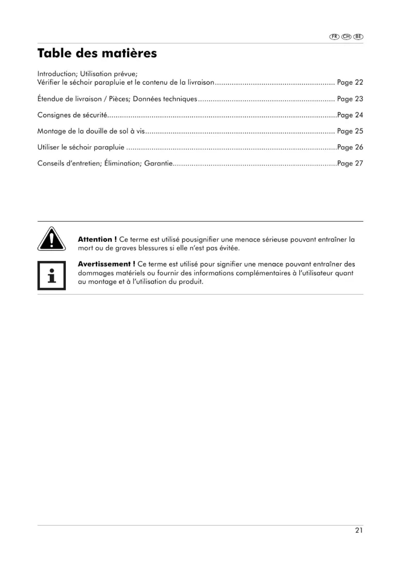 - Ein als defekt erfasstes Produkt können Sie dann unter Beifügung des Kaufbelegs (Kassenbon) und der Angabe, worin der Mangel besteht und wann er aufgetreten ist, für Sie portofrei an die Ihnen mitgeteilte Service-Anschrift übersenden. Auf www.lidl-service.com können Sie diese und viele weitere Handbücher, Produktvideos und Software herunterladen. Service JUWEL H. Wüster GmbH E-Mail: kund@juwel.com Telefon: 0049-8821-1679 Sitz: DEUTSCHLAND IAN 29077521 FR CH BE Table des matières Introduction; Utilisation prévue; Vérifier le séchoir parapluie et le contenu de la livraison ......................................................... Page 22 Étendue de livraison / Pièces; Données techniques ................................................................. Page 23 Consignes de sécurité .............................................................................................................Page 24 Montage de la douille de sol à vis .......................................................................................... Page 25 Utiliser le séchoir parapluie ....................................................................................................Page 26 Conseils d’entretien; Élimination; Garantie..............................................................................Page 27 Attention ! Ce terme est utilisé pousignifier une menace sérieuse pouvant entraîner la mort ou de graves blessures si elle n’est pas évitée. Avertissement ! Ce terme est utilisé pour signifier une menace pouvant entraîner des dommages matériels ou fournir des informations complémentaires à l’utilisateur quant au montage et à l’utilisation du produit.22 FR CH BE Introduction Félicitations ! Avec votre achat, vous avez opté pour un produit de qualité. Veuillez vous familiariser avec le produit avant l’installation et la mise en service. Ce mode d’emploi appartient à ce séchoir parapluie aluminium. Il contient des informations importantes pour l’assemblage et l’utilisation. Pour plus de compréhensibilité, le séchoir parapluie en aluminium n’est appelé que séchoir parapluie par la suite. Lisez attentivement le mode d’emploi, en particulier les consignes de sécurité, avant d’utiliser le séchoir parapluie. Le non-respect de ce mode d’emploi peut provoquer de graves blessures ou endommager le séchoir parapluie. Le mode d’emploi est basé sur les normes et règlementations en vigueur dans l’Union européenne. A l’étranger, veuillez respecter les directives et lois spécifiques au pays. Conservez le mode d’emploi pour des utilisations futures. Si vous transmettez le séchoir parapluie à des tiers, joignez obligatoirement le mode d’emploi. Utilisation prévue