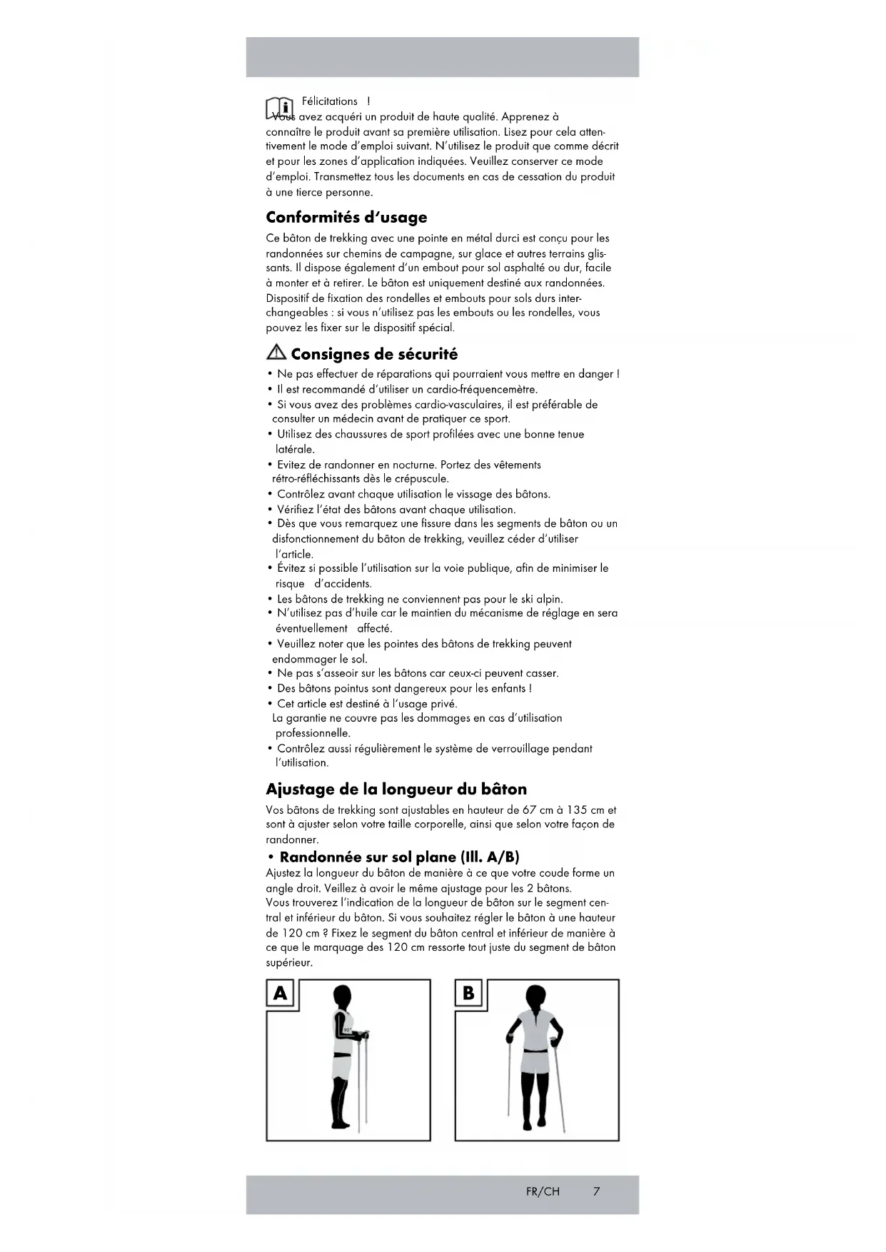 - Randonnée sur sol plane (Ill. A/B) Ajustez la longueur du bâton de manière à ce que votre coude forme un angle droit. Veillez à avoir le même ajustage pour les 2 bâtons. Vous trouverez l‘indication de la longueur de bâton sur le segment cen- tral et inférieur du bâton. Si vous souhaitez régler le bâton à une hauteur de 120 cm ? Fixez le segment du bâton central et inférieur de manière à ce que le marquage des 120 cm ressorte tout juste du segment de bâton supérieur. FR/CH A B8