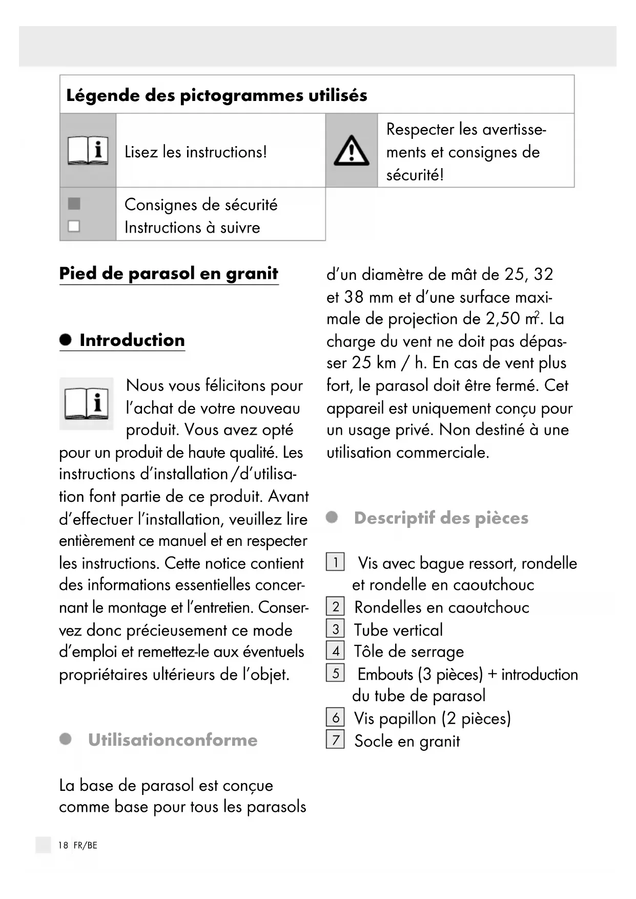 u rebut dans les déchetteries locales. À la fin de sa durée de vie, débar- rassez-vous de ce produit de la même façon que vos déchets courants. Le produit est recyclable, soumis à la responsabilité élargie du fabricant et collecté séparément. Garantie Article L217-16 du Code de la consommation Lorsque l‘acheteur demande au vendeur, pendant le cours de la garantie commerciale qui lui a été consentie lors de l‘acquisition ou de la réparation d‘un bien meuble, une remise en état couverte par la garantie, toute période d‘immobili- sation d‘au moins sept jours vient s‘ajouter à la durée de la garantie qui restait à courir. Cette période court à compter de la demande d‘intervention de l‘acheteur ou de la mise à disposition pour réparation du bien en cause, si cette mise à disposition est postérieure à la demande d‘intervention. Indépendamment de la garantie commerciale souscrite, le vendeur reste tenu des défauts de conformité du bien et des vices rédhibitoires dans les conditions prévues aux ar- ticles L217-4 à L217-13 du Code de la consommation et aux articles 1641 à 1648 et 2232 du Code Civil. Article L217-4 du Code de la consommation Le vendeur livre un bien conforme au contrat et répond des défauts de conformité existant lors de la délivrance. Il répond également des défauts de conformité résultant de l‘emballage, des instructions de montage ou de l‘installation lorsque celle-ci a été mise à sa charge par le contrat ou a été réalisée sous sa responsabilité. Article L217-5 du Code de la consommation Le bien est conforme au contrat : 1° S´il est propre à l‘usage ha- bituellement attendu d‘un bien semblable et, le cas échéant : - s‘il correspond à la description donnée par le vendeur et pos- séder les qualités que celui-ci a présentées à l‘acheteur sous23 FR/BE forme d‘échantillon ou de mo- dèle ; - s‘il présente les qualités qu‘un acheteur peut légitimement attendre eu égard aux déclara- tions publiques faites par le vendeur, par le producteur ou par son représentant, notamment dans la publicité ou l‘étiquetage ; 2° Ou s‘il présente les caracté- ristiques définies d‘un com- mun accord par les parties ou être propre à tout usage spécial recherché par l‘ache- teur, porté à la connaissance du vendeur et que ce dernier a accepté. Article L217-12 du Code de la consommation L‘action résultant du défaut de conformité se prescrit par deux ans à compter de la délivrance du bien. Article 1641 du Code civil Le vendeur est tenu de la garantie à raison des défauts cachés de la chose vendue qui la rendent impropre à l‘usage auquel on la destine, ou qui diminuent tellement cet usage que l‘acheteur ne l‘aurait pas ac- quise, ou n‘en aurait donné qu‘un moindre prix, s‘il les avait connus. Article 1648 1er alinéa du Code civil L‘action résultant des vices rédhibi- toires doit être intentée par l‘acqué- reur dans un délai de deux ans à compter de la découverte du vice. Les pièces détachées indispensables à l’utilisation du produit sont dispo- nibles pendant la durée de la garantie du produit.2425 NL/BE Legenda van de gebruikte pictogrammen ..................Pagina 26 Inleiding .....................................................................................Pagina 26 Correct gebruik ...........................................................................Pagina 26 Beschrijving van de onderdelen ................................................Pagina 26 Technische gegevens .................................................................Pagina 27 Veiligheidsinstructies ............................................................ Pagina 27 Montage .....................................................................................Pagina 28 Voet monteren ............................................................................Pagina 28 Inzetstukken gebruiken ...............................................................Pagina 29 Opbergen en onderhoud .................................................... Pagina 29 Service.........................................................................................Pagina 29 Afvoer .........................................................................................Pagina 3026 NL/BE Legenda van de gebruikte pictogrammen Instructies lezen! Neem de veiligheidsin- structies in acht! Veiligheidsinstructies Handelingsinstructies Granieten parasolstandaard Inleiding Hartelijk gefeliciteerd met de aankoop van uw nieuwe product. U heeft voor een hoogwaardig product gekozen. De (montage-) handleiding is onderdeel van dit product. Lees voor de mon- tage deze gebruiksaanwijzing alstu- blieft volledig door en neem de instructies in acht. Deze instructies bevatten belangrijke informatie voor de montage en het onderhoud. Bewaar de handleiding daarom goed en geef deze ook door aan een eventuele volgende bezitter. Correct gebruik De parasolvoet is geschikt als voet voor parasols met een stokdiameter van 25, 32 en 38 mm en een maxi- maal geprojecteerd schermopper- vlak van 2,50 m