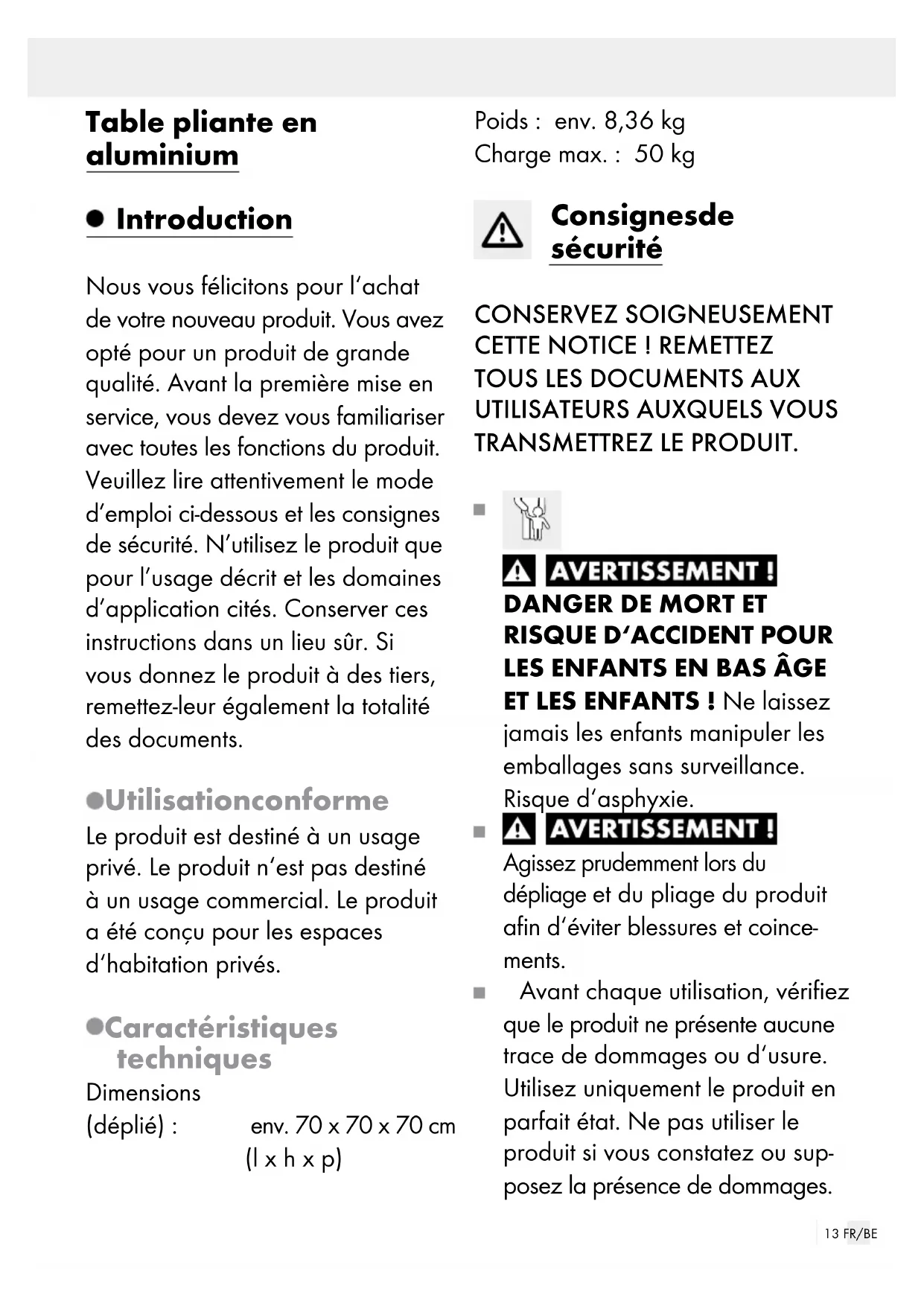 ET LES ENFANTS ! Ne laissez jamais les enfants manipuler les emballages sans surveillance. Risque d‘asphyxie. Agissez prudemment lors du dépliage et du pliage du produit afin d‘éviter blessures et coince- ments. Avant chaque utilisation, vérifiez que le produit ne présente aucune trace de dommages ou d‘usure. Utilisez uniquement le produit en parfait état. Ne pas utiliser le produit si vous constatez ou sup- posez la présence de dommages.14 FR/BE Veillez à utiliser le produit sur une surface stable. Assurez-vous que le produit se trouve avant utilisation sur une surface stable et plane. Dans la cas contraire, le produit pourrait se trouver en position instable et tomber/basculer sur le côté. Des blessures ou dommages matériels peuvent en résulter. 50 kg Notez que la charge max. supportée est de 50 kg. Lorsque cette limite de poids est dépassée, des blessu- res ou dommages matériels peuvent en résulter. Assurez-vous que personne, en particulier des enfants, ne monte sur le produit ou ne s‘y appuie. Le produit peut basculer. Ne jamais s‘asseoir, ni prendre appui sur le produit. Veillez à ce que vos mains s‘accèdent pas au mécanisme de pliage, ceci afin d‘éviter toute blessure. Lors du dépliage, veillez à ce que le mécanisme de pliage s‘enclenche correctement avant d‘utiliser le produit. Veillez à ce que le produit soit complètement ouvert avant de l‘utiliser. Le produit n‘est pas un jouet et il ne doit être utilisé que sous la surveillance d‘un adulte. Le produit ne doit pas être escaladé et n‘est pas un jouet. En cas de conditions météorolo- giques extrêmes, par ex. en cas de vent fort, sécurisez le produit. N‘utilisez pas le produit à proxi- mité d‘un feu ouvert.