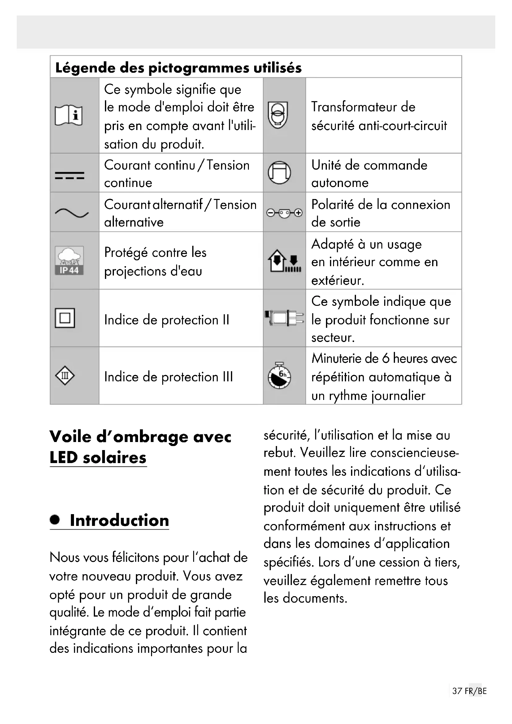 avant chaque montage, démontage ou nettoyage du produit. Ne touchez ni la fiche du pro- duit ni le produit avec des mains mouillées. Le produit ne doit pas être rac- cordé électriquement à une autre guirlande lumineuse. Veuillez seulement utiliser ce produit avec l’adaptateur sec- teur fourni (S016G045W8D). Veuillez noter que l’adaptateur secteur consomme une faible quantité d’électricité même lorsque le produit lumineux n’est pas en état de marche, et ce aussi longtemps que l’ali- mentation électrique est bran- chée au secteur. Pour éteindre42 FR/BE complètement le produit, déb ran- chez l’adaptateur du secteur. Les LED ne peuvent pas être remplacées. Si les LED arrivent en fin de vie, l’ensemble du produit doit être remplacé. Risque de blessures et de dégâts matériels! La voile solaire vous protège de l’exposition directe au soleil. Vous devez néanmoins vous assurer que votre peau est cor- rectement protégée du soleil. Lors du montage et du démon- tage, veillez aux extrémités ou- vertes des tuyaux. Il existe un risque de blessures! Démontez la voile solaire lors que vous vous attendez à une vitesse de vent supérieure à 40km / h. Gardez les feux ouverts, les barbecues, les chauffages de terrasse et autres appareils de chauffage éloignés de la voile solaire. Les poches d’eau qui appa- raissent doivent être vidées! Ne laissez pas sans surveil- lance la voile solaire montée. Consignes de sécurité relatives aux piles / aux piles rechargeables DANGER DE MORT! Rang