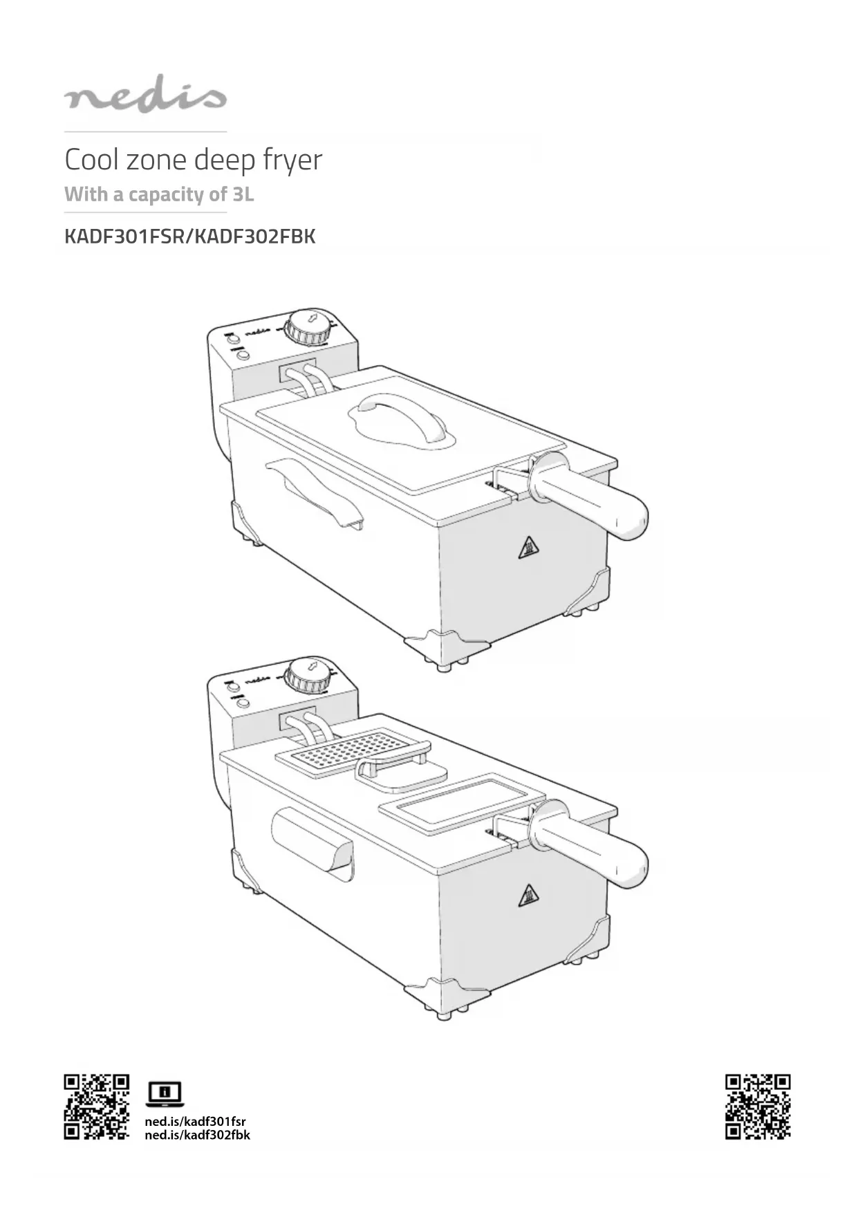 Guide de démarrage rapide Friteuse zone froide KADF301FSR/KADF302FBKPour plus d'informations, consultez le manuel détaillé en ligne : ned.is/kadf301fsr ned.is/kadf302fbk Utilisation prévue La Nedis KADF301FSR / KADF302FBK est une friteuse avec une capacité de 3.0 L.Ce produit est destiné uniquement à frire des aliments.Le produit est prévu pour un usage intérieur uniquement.Le produit n’est pas destiné à un usage professionnel.Ce produit est destiné à être utilisé dans des environnements domestiques pour des fonctions ménagères typiques ainsi que par des utilisateurs non experts pour des fonctions ménagères typiques.Ce produit peut être utilisé par des enfants âgés de 12 ans et plus ainsi que des personnes ayant des capacités physiques, sensorielles ou mentales réduites ou manquant d’expérience et de connaissances s’ils sont supervisés ou ont reçu des instructions sur l’utilisation du produit en toute sécurité et comprennent les dangers impliqués. Les enfants ne doivent pas jouer avec le produit. Le nettoyage et la maintenance ne doivent pas être eectués par des enfants sans surveillance.Toute modication du produit peut avoir des conséquences sur la sécurité, la garantie et le bon fonctionnement. Spécications Produit Friteuse FriteuseArticle numéro KADF301FSR KADF302FBKDimensions (L x l x H)308 x 210 x 170 mm 308 x 210 x 170 mmPoids 2,3 kg 2,4 kg