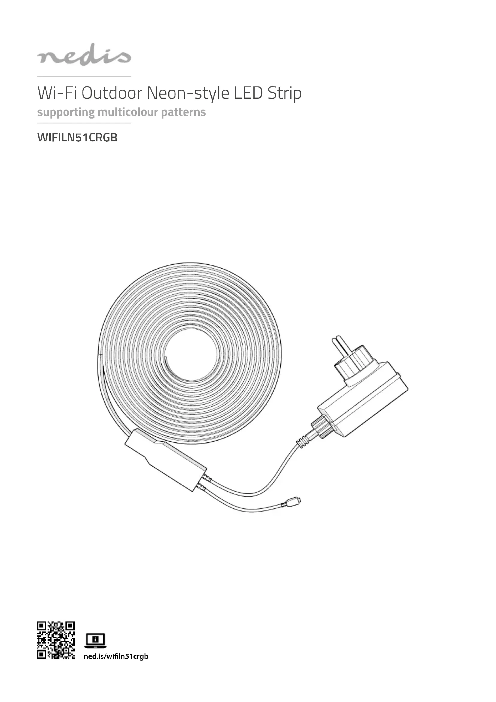 Snelstartgids Wi-Fi LED-strip voor buiten in neonstijl WIFILN51CRGBZie voor meer informatie de uitgebreide handleiding online: ned.is/wiln51crgb Bedoeld gebruik Dit product is een Slimme wi-LED-strip met een draadloze afstandsbediening.Het product is niet bedoeld voor professioneel gebruik.Het product is enkel bedoeld voor gebruik binnenshuis.Elke wijziging van het product kan gevolgen hebben voor de veiligheid, garantie en correcte werking. Specicaties Product Wi-Fi LED-strip voor buiten in neonstijlArtikelnummer WIFILN51CRGBLED-snoerLED-strip-lengte 5 mLED-strip-breedte 17 mmHelderheid 960 lmLichtkleur RGBLED-type 5050Aantal LEDs 60 /mAansluiting NEMOVermogen 32 WWaterdicht IP65Bedrijfstemperatuur -20 °C – 50 °C• Ne pas utiliser le produit si une pièce est endommagée ou défectueuse. Remplacez immédiatement un produit endommagé ou défectueux.• Ne pas laisser tomber le produit et éviter de le cogner.• Ne débranchez pas le produit en tirant sur le câble. Saisissez toujours la che et tirez.• Ce produit ne peut être réparé que par un technicien qualié an de réduire les risques d'électrocution.• Gardez toujours les piles bouton, chargées et déchargées, hors de portée des enfants an d’éviter tout risque d’ingestion. Jetez les piles usagées immédiatement et en toute sécurité. Si elles sont avalées, les piles bouton peuvent provoquer de graves brûlures chimiques internes en seulement deux heures. Gardez à l'esprit que les premiers symptômes peuvent ressembler à des maladies infantiles comme la toux ou la bave. Si vous pensez que des piles ont été avalées, consultez immédiatement un médecin.• N’alimentez le produit qu’avec la tension correspondant aux inscriptions gurant sur le produit.• Les piles non rechargeables ne doivent pas être rechargées.• Ne pas court-circuiter une batterie.• Assurez-vous de faire correspondre les repères de polarité (+) et (-).• Pour des informations plus détaillées sur l'élimination de votre batterie usagée, consultez les règles et réglementations locales pour connaître les instructions relatives à une élimination correcte. Installer l'application 1. Téléchargez l'application Nedis Smartlife pour Android ou iOS sur votre téléphone via Google Play ou l’App Store d’Apple.2. Ouvrez l'application Nedis Smartlife sur votre téléphone.3. Créez un compte avec votre adresse e-mail et appuyez sur Continue (Continuer).4. Entrez le code de vérication reçu.5. Créez un mot de passe et appuyez sur Done (Terminé).6. Appuyez sur Add Home (Ajouter les familles) pour créer une maison SmartLife.7. Dénissez votre emplacement, choisissez les pièces avec lesquelles vous souhaitez vous connecter et appuyez sur Done (Terminé). Connecter le produit