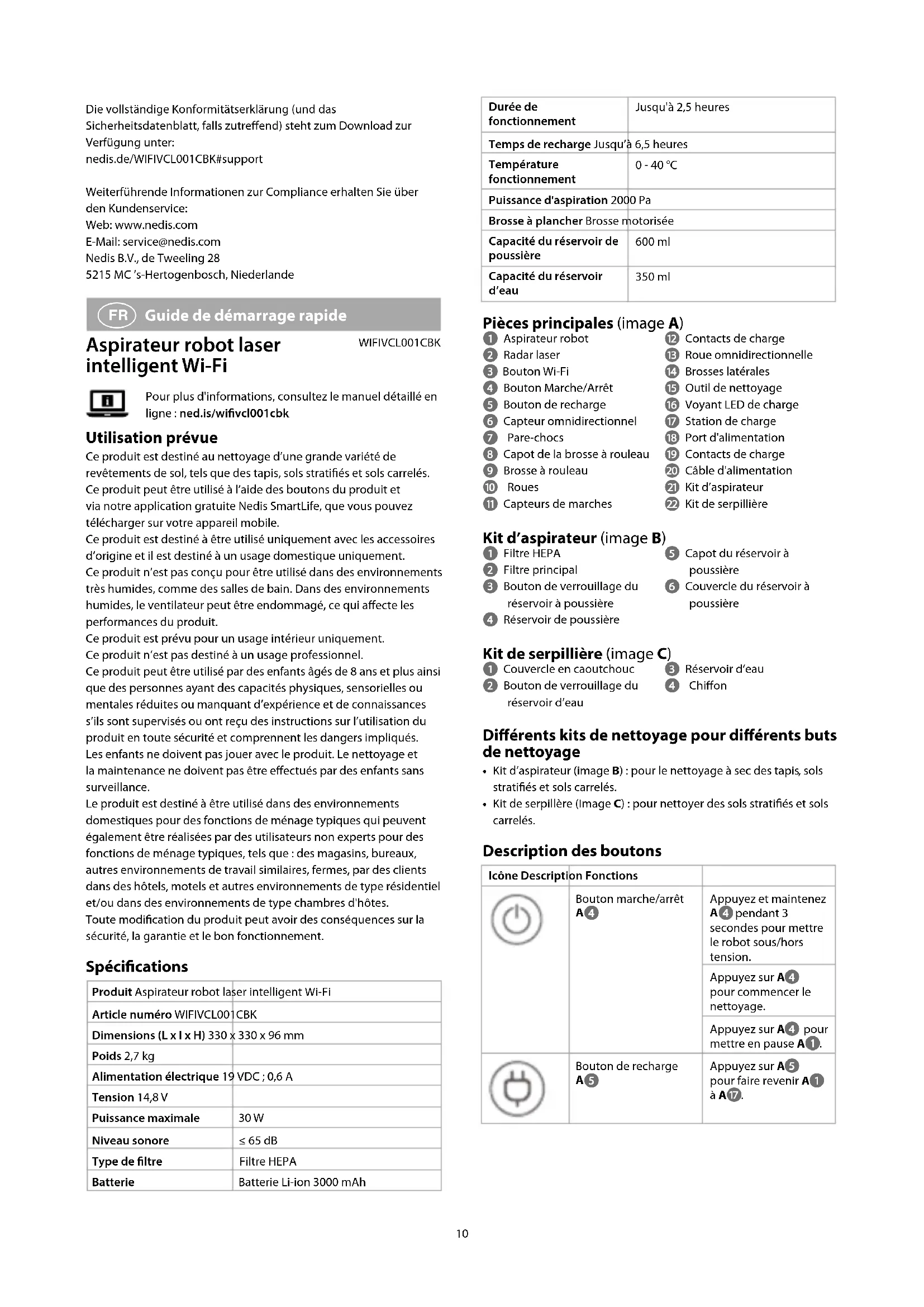 clignote pour indiquer que le robot est en cours de charge.Une fois la charge terminée, A s’allume en continu. Le temps de recharge est d’environ 6,5 heures. Le robot doit être chargé à 20 % minimum pour démarrer un nettoyage programmé. Lorsque la batterie est déchargée, le robot retourne automatiquement à A pour recharge. Une fois le robot rechargé, il retourne automatiquement au point où il s’était arrêté pour continuer le nettoyage. Si le robot ne revient pas à A , le robot revient automatiquement au point de départ. Déclaration de conformité Nous, Nedis B.V., déclarons en tant que fabricant que le produit WIFIVCL001CBK de notre marque Nedis , produit en Chine, a été testé conformément à toutes les normes et réglementations CE en vigueur et que tous les tests ont été réussis. Cela inclut, sans toutefois s'y limiter, la directive RED 2014/53/UE.La Déclaration de conformité complète (et la che de sécurité le cas échéant) peut être trouvée et téléchargée via:nedis.fr/WIFIVCL001CBK#supportPour plus d'informations sur la conformité, contactez le service client:Site Web: www.nedis.comE-mail: service@nedis.comNedis B.V., de Tweeling 285215 MC ’s-Hertogenbosch, Pays-Bas